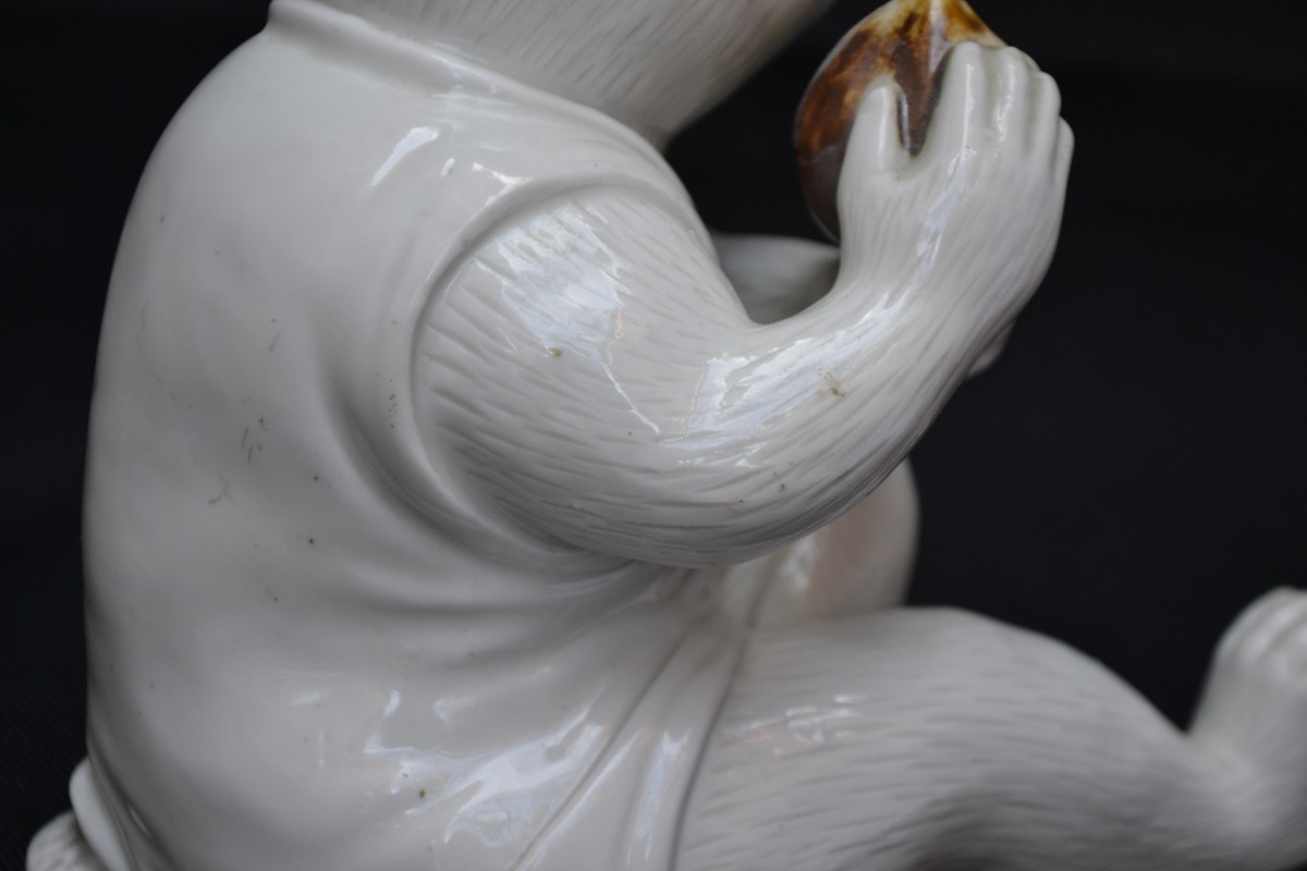 Singe tenant dans sa main une pêche de la longévité. Porcelaine du Kyushu, fours de Mikawachi pour les seigneurs d'Hirado. L'animal est vétu d'un kimono. La porcelaine est d'un blanc pur recouvert de glassure transparente. La face est teintée de rose, la pêche est émaillée en brun de fer et bleu de cobalt. Fin de la période d'Edo. Le LACMA héberge un singe similaire mais de moins belle qualité, ciselure moins précise ,émaux ternes, forme des pieds et des mains inélégante, probablement fait pour l'exportation.