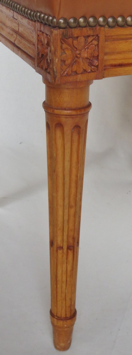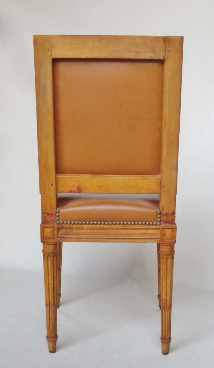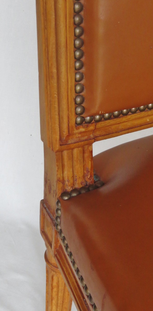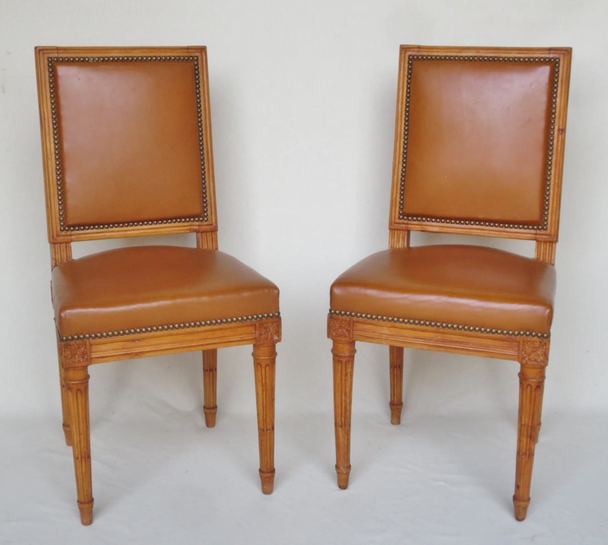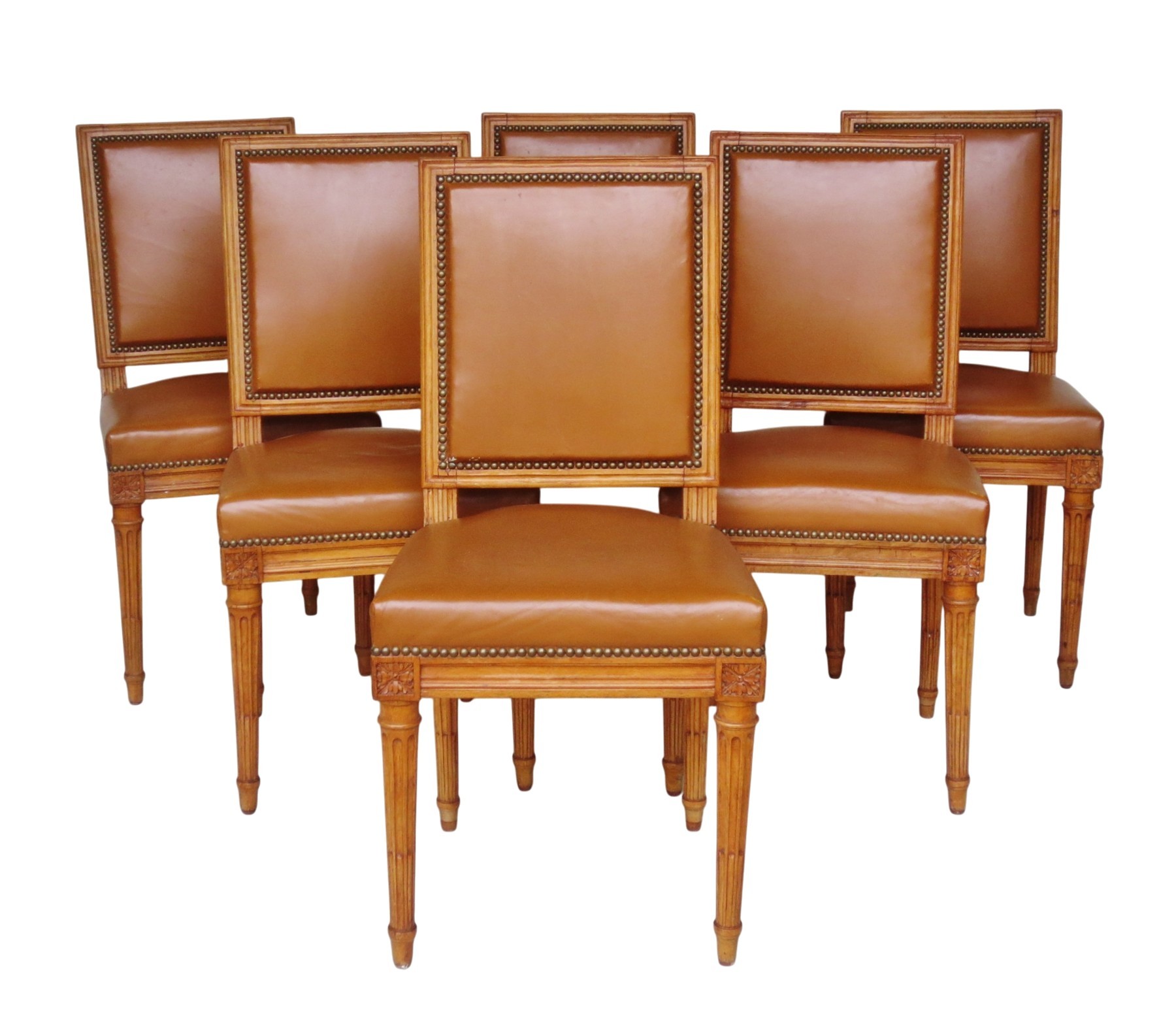Ces six belles chaises tapissées en cuir de couleur gold ont un dossier de forme carré, l'assise repose sur quatre pieds tournés, cannelés et rudentés, les dés de raccordement antérieurs sont finement sculptés d'une fleurette, les traverses et montants sont moulurées. En bon état général elles sont estampillées de Jean Baptiste Tilliard, estampilles plus ou moins déchiffrables.