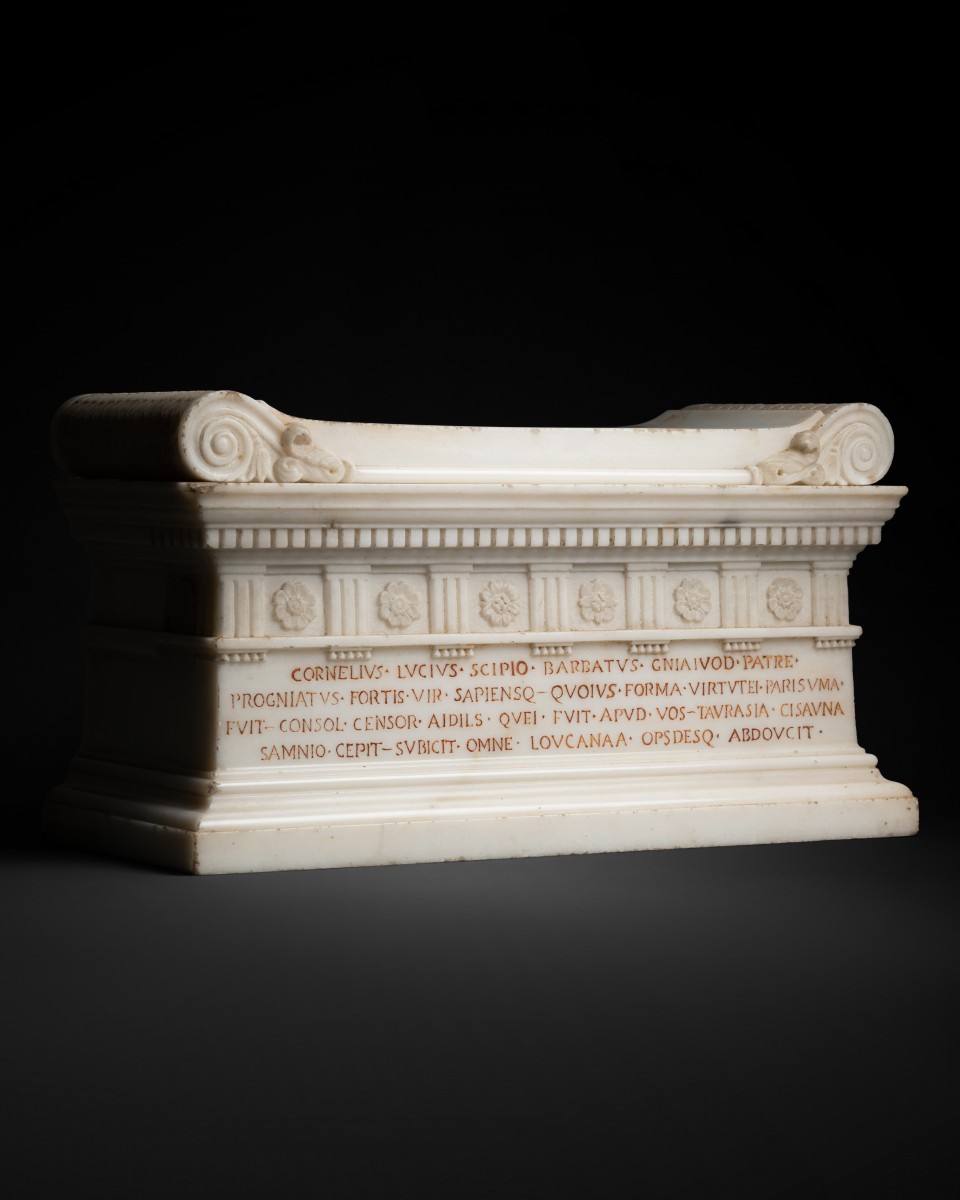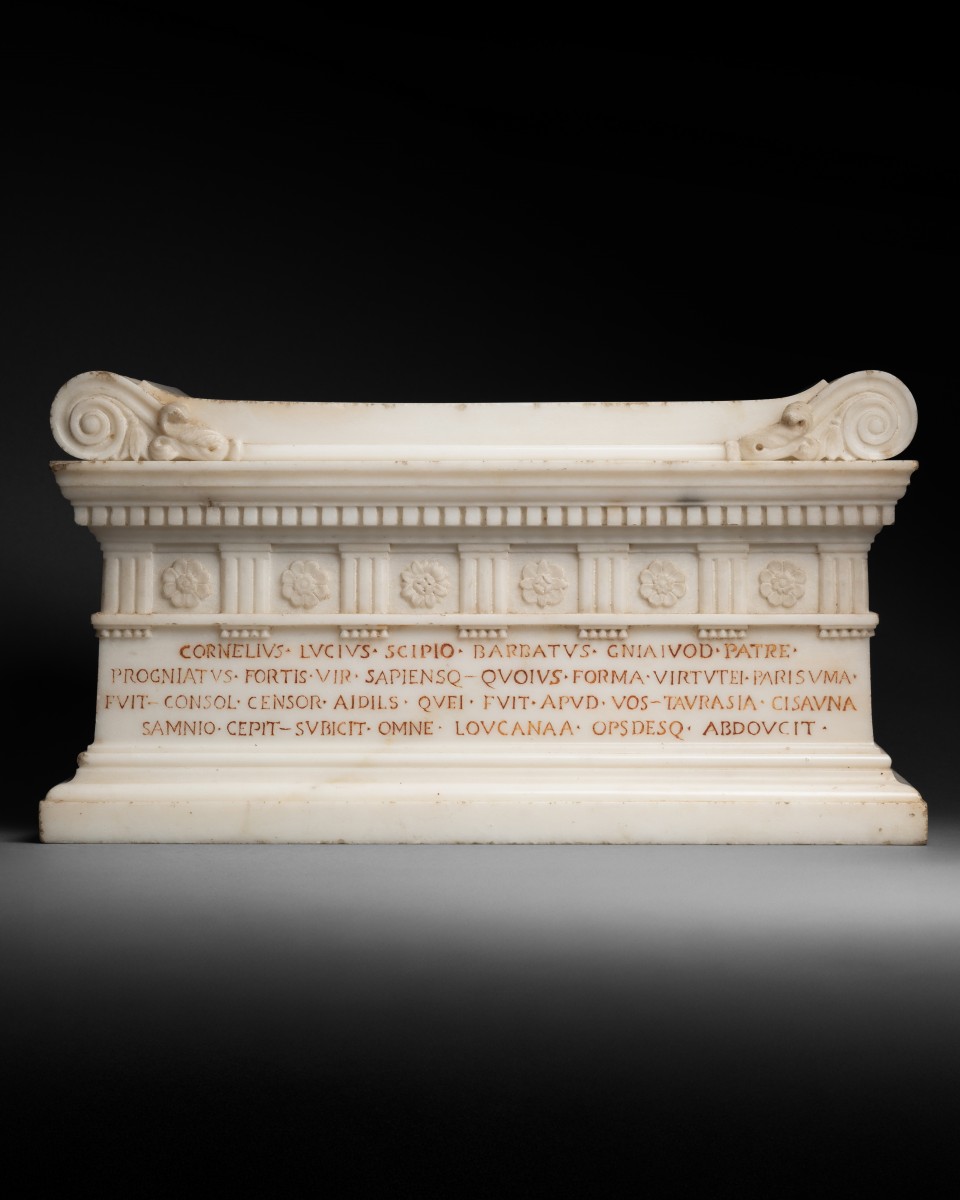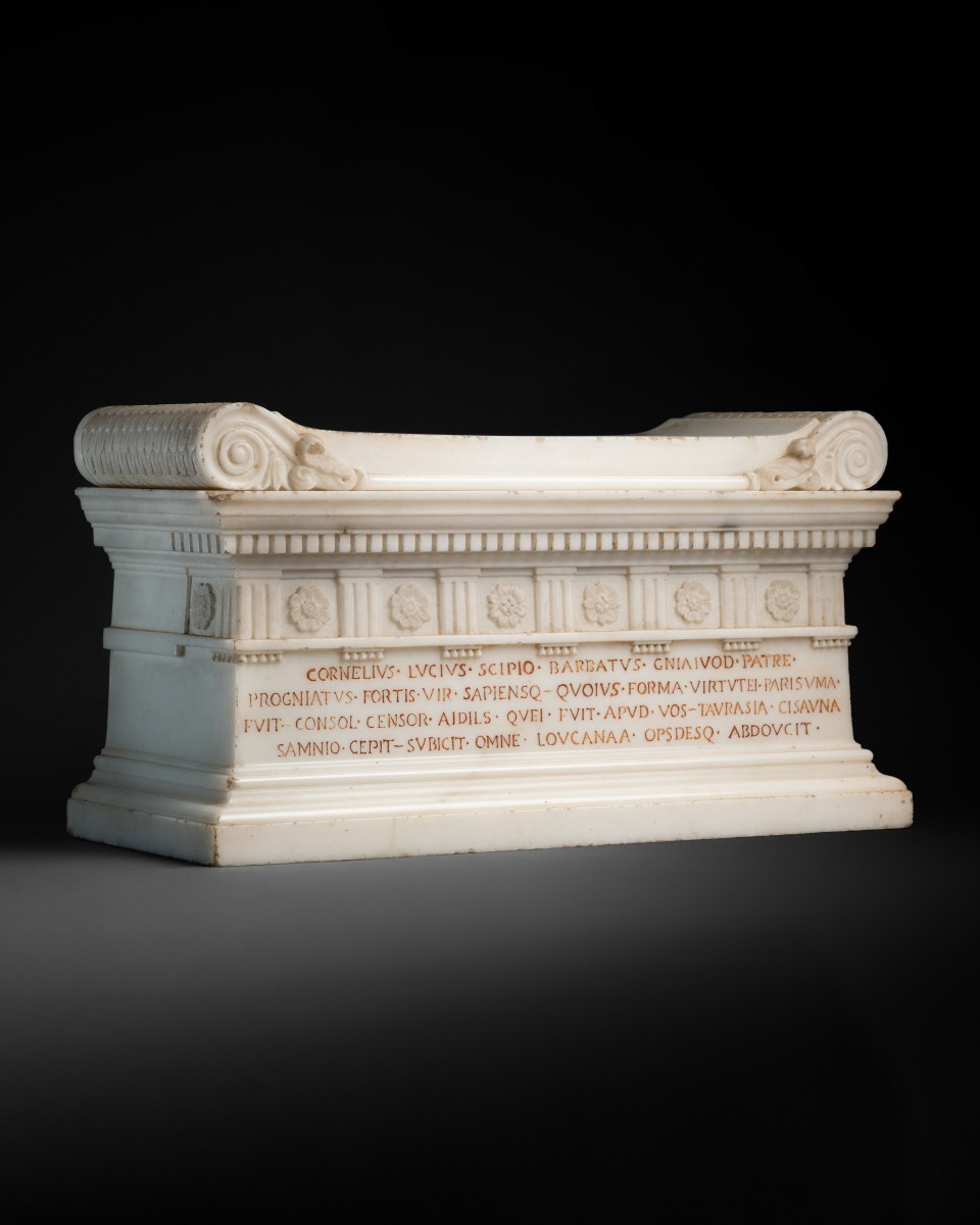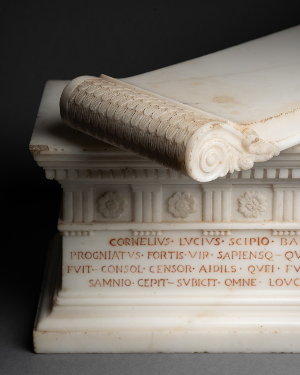 Cette maquette reproduit le sarcophage de Lucius Cornelius Scipio Barbatus, découvert à Rome, en 1780, dans la tombe des Scipion, le long de la via Appia. Unique sarcophage retrouvé intact dans cet ensemble funéraire, l’original fut transféré par Pie VI au Museo Pio-Clementino, au Vatican, où il demeure l’un des jalons majeurs de la sculpture républicaine romaine.