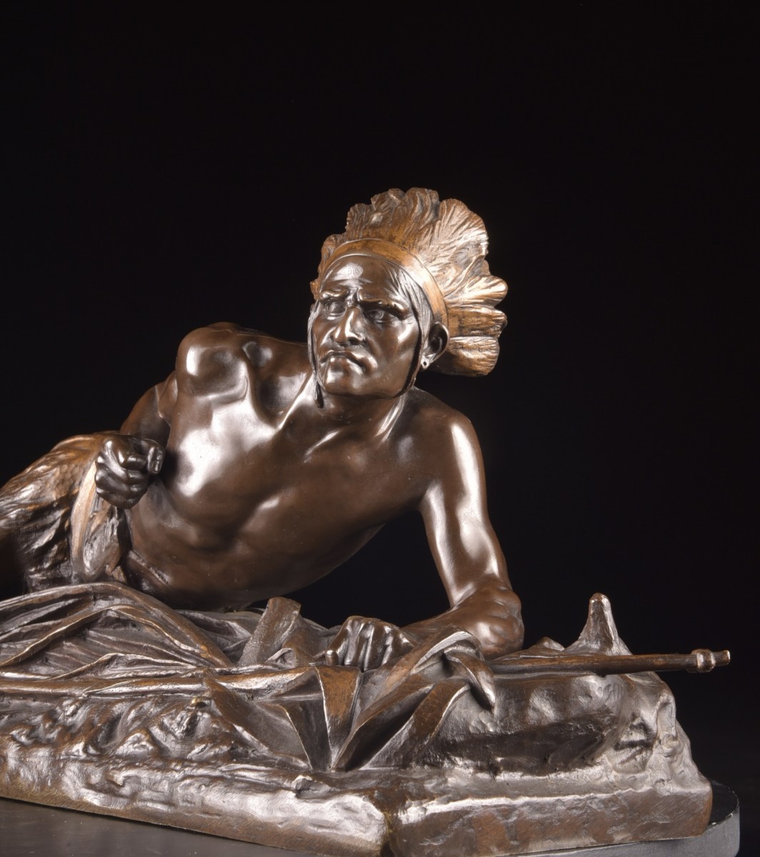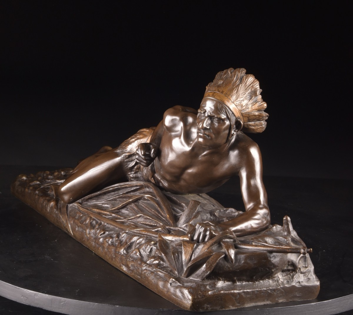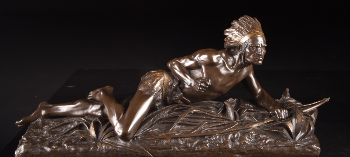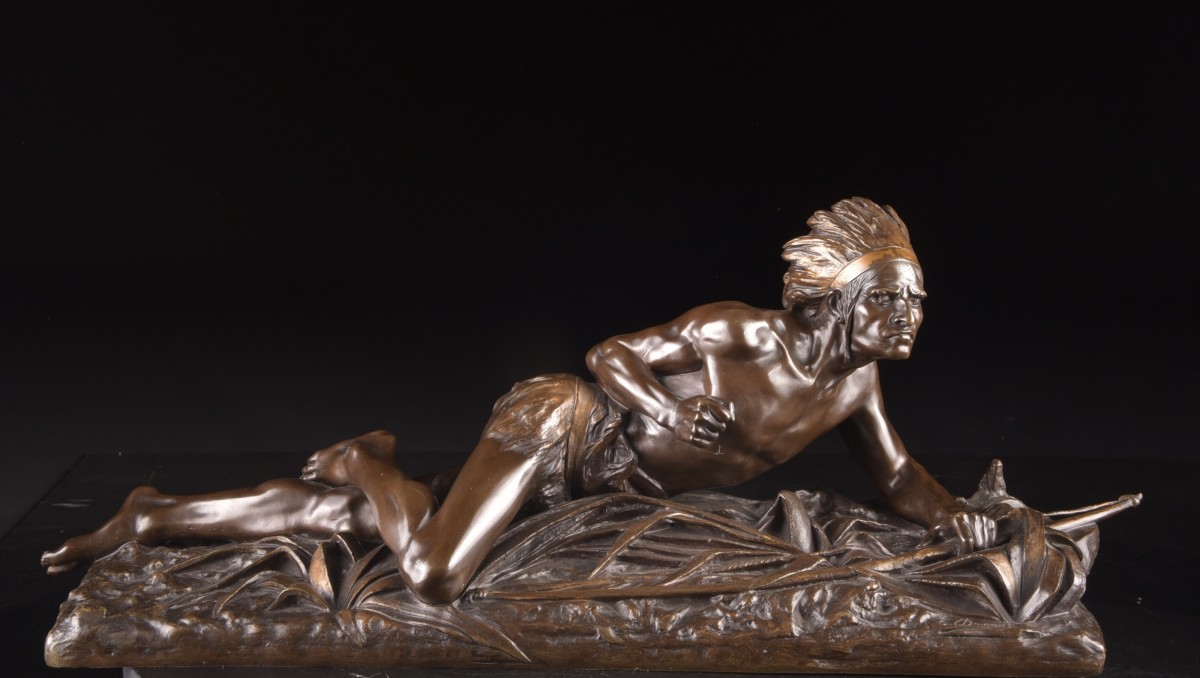 This finely executed bronze sculpture by Edouard DROUOT (1859–1945) depicts an Indigenous hunter captured in a moment of intense concentration, lying in ambush. Titled “Indien à l’affût” (“Indian on the lookout”), the work conveys both physical strength and psychological tension, characteristic of Drouot’s expressive naturalism. The figure is modeled with remarkable anatomical precision, while the textured base, suggesting ground cover and vegetation, enhances the realism and narrative quality of the composition. The bronze displays a rich, warm patina, highlighting the sculptor’s refined surface treatment and attention to detail. The sculpture is signed and titled on the base, confirming its authenticity. A strong example of French sculpture from the late 19th to early 20th century, combining ethnographic subject matter with academic craftsmanship.