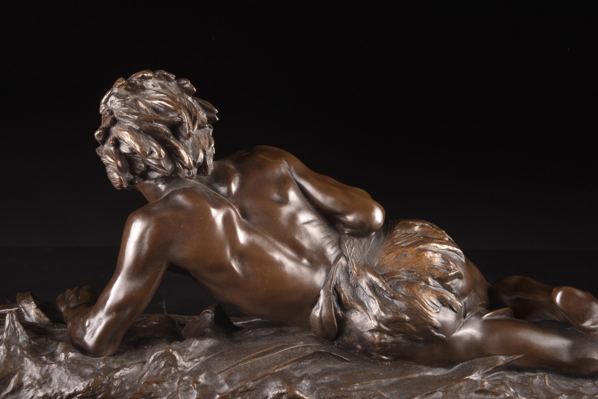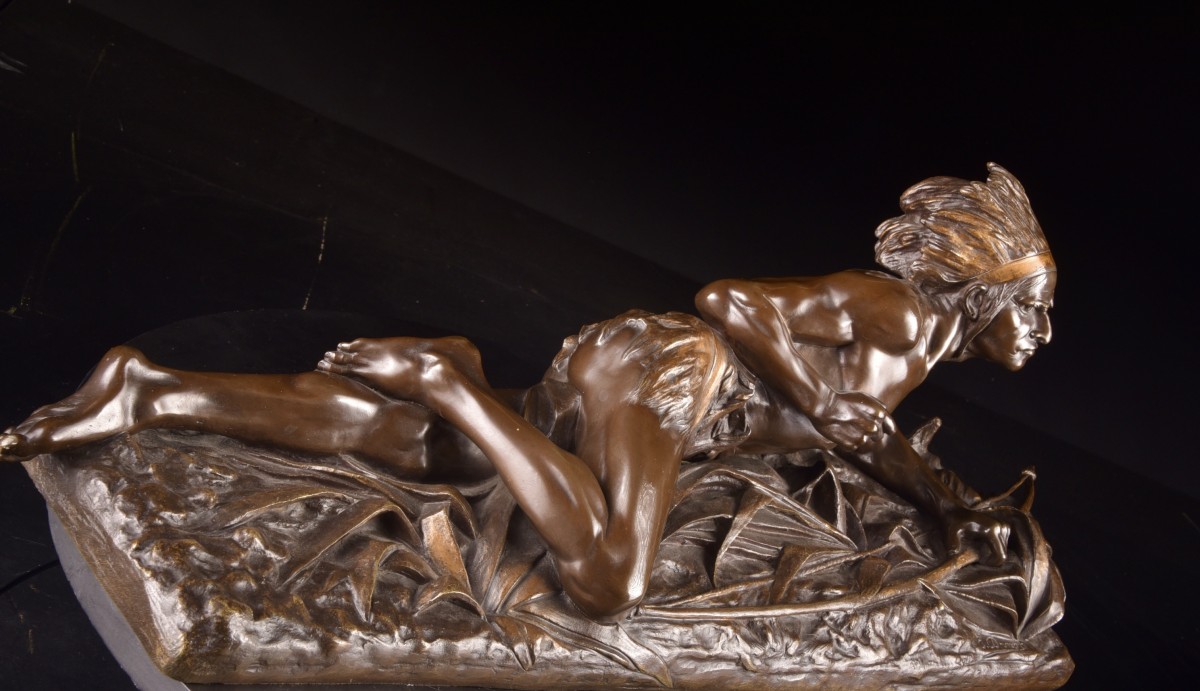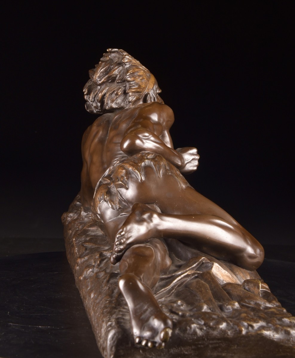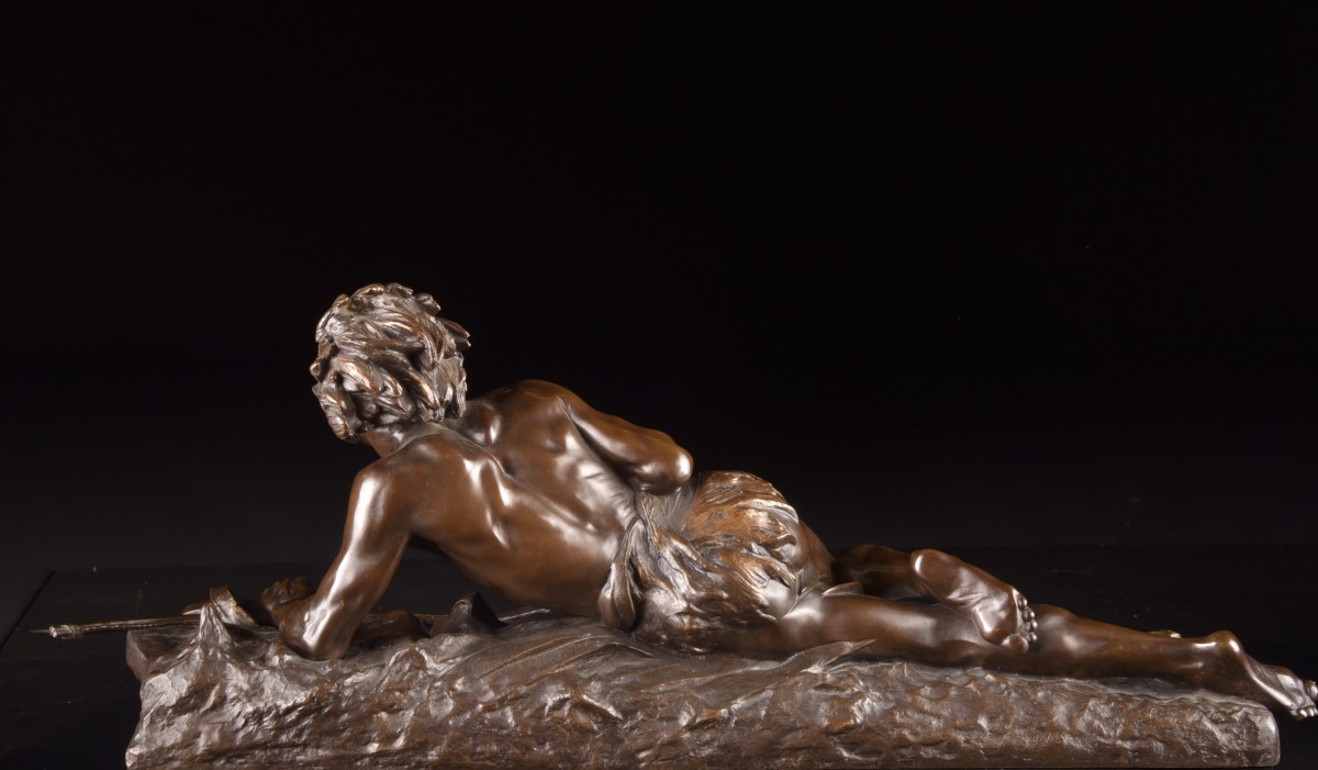 This finely executed bronze sculpture by Edouard DROUOT (1859–1945) depicts an Indigenous hunter captured in a moment of intense concentration, lying in ambush. Titled “Indien à l’affût” (“Indian on the lookout”), the work conveys both physical strength and psychological tension, characteristic of Drouot’s expressive naturalism. The figure is modeled with remarkable anatomical precision, while the textured base, suggesting ground cover and vegetation, enhances the realism and narrative quality of the composition. The bronze displays a rich, warm patina, highlighting the sculptor’s refined surface treatment and attention to detail. The sculpture is signed and titled on the base, confirming its authenticity. A strong example of French sculpture from the late 19th to early 20th century, combining ethnographic subject matter with academic craftsmanship.