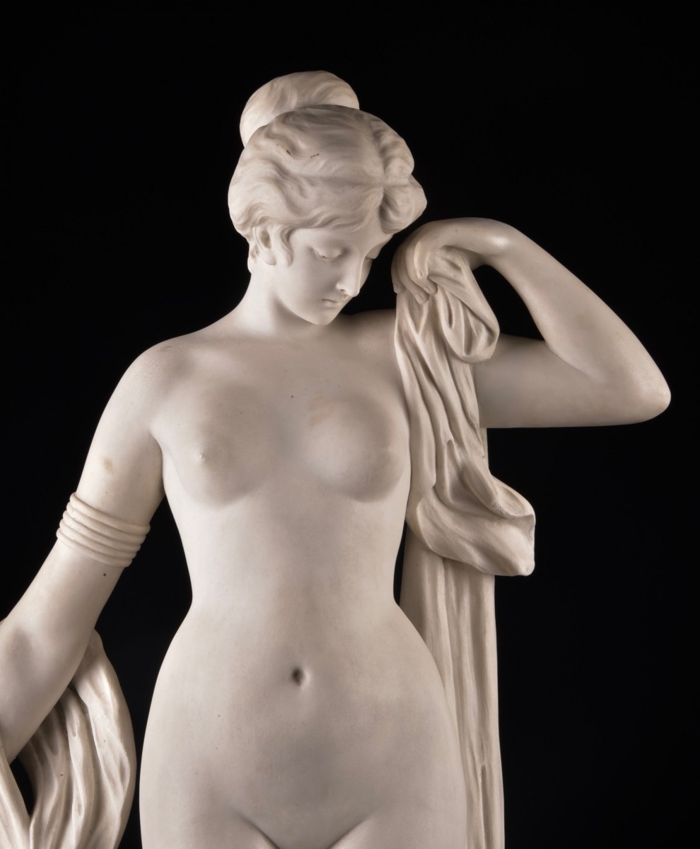 Exécutée dans un style néoclassique, cette figure représente la célèbre courtisane grecque dans une attitude à la fois pudique et subtilement dévoilée, tenant un drapé finement sculpté. La qualité du modelé, la douceur de l’anatomie et l’élégance de la composition confèrent à l’ensemble une présence harmonieuse et intemporelle.