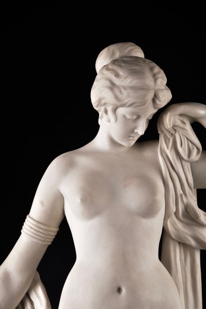 Importante statue en marbre de Carrare représentant Phryné, œuvre de Pierre-Étienne Daniel Campagne (1851–1910).