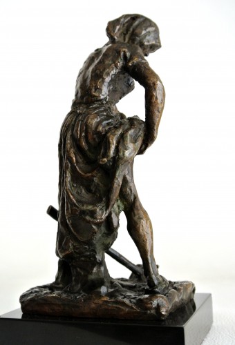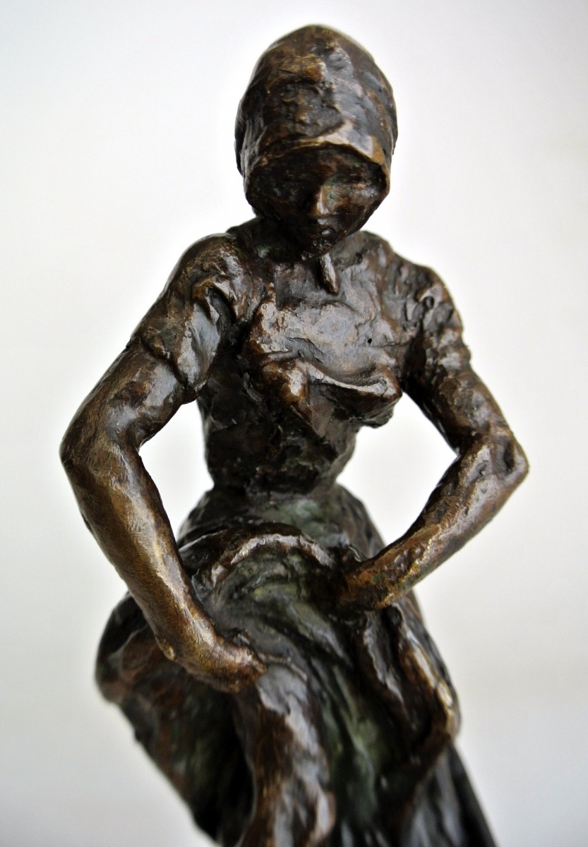 Statuette en bronze signée Gaston Broquet décrivant une scène réaliste où une paysanne travaillant la terre, réajuste son bas. Editée par le fondeur Susse Frères durant la première partie du XXème siècle (1930/1940), la patine brune est d’origine et en très bon état de présentation. La base rectangulaire est en marbre noir de Belgique (très fines brèches), les dimensions indiquées ne tiennent pas compte de ce socle. Signature du sculpteur et marque de la fonderie Susse.