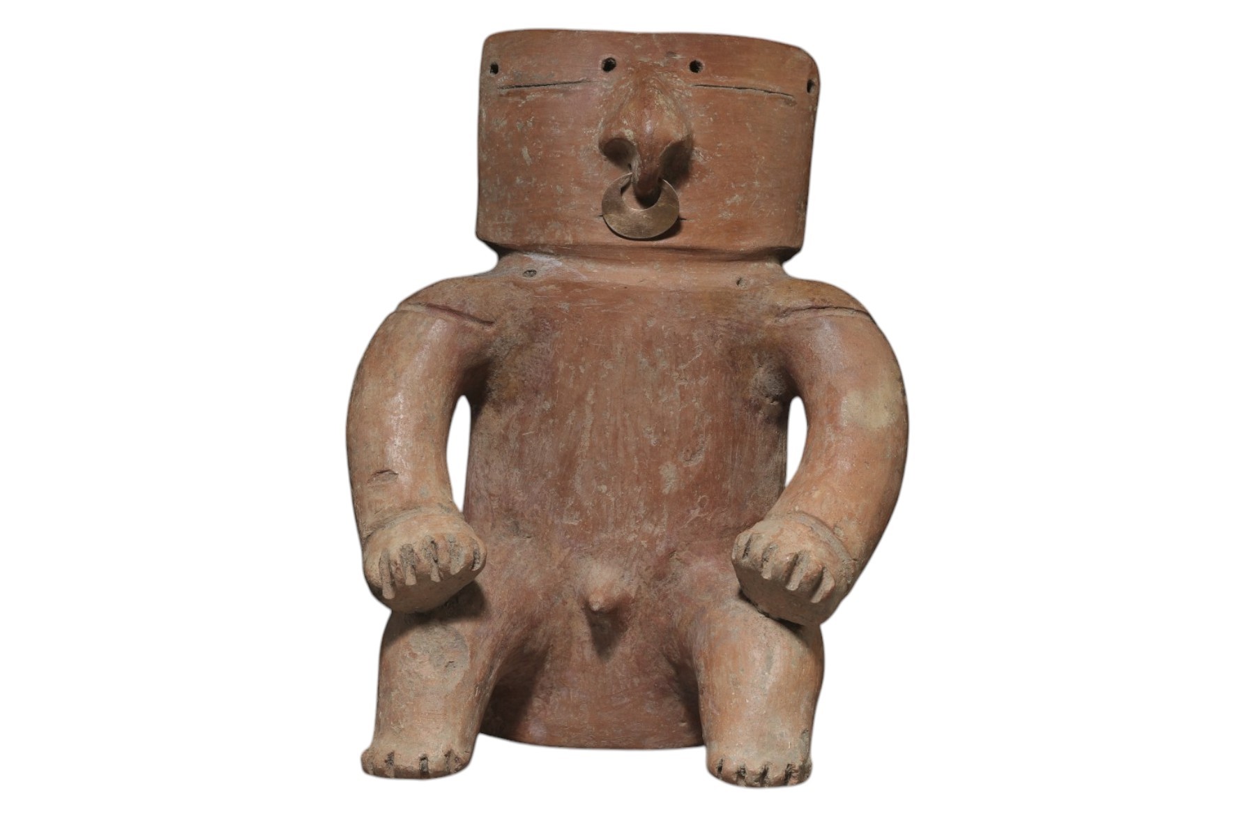 La sculpture présente un modelé simple mais expressif, propre à l’art céramique Quimbaya, souvent associé à des représentations rituelles ou funéraires. La posture assise et les traits stylisés rappellent les figurations symboliques liées à des croyances chamaniques ou à un statut social élevé.