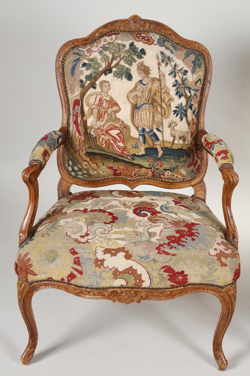 Beau travail Louis XV estampillé sur les quatre fauteuils de Bauve (Mathieu Bauve, menuisier reçu maître en 1754) avec sa tapisserie XVIII, aux petits points.