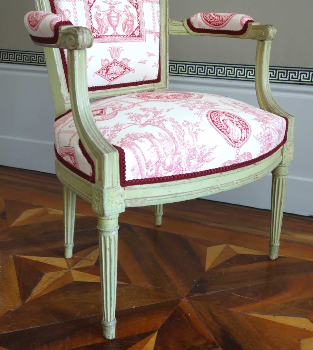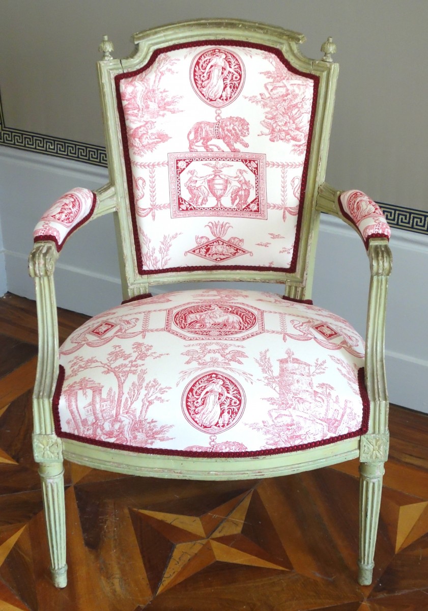 Suite de 4 fauteuils cabriolets en bois laqué vert, élégant modèle en chapeau de gendarme à plumets. Couverture en toile imprimée rose rouge dans le goût des toiles de Jouy, ce qui leur donne une grande fraîcheur. Travail parisien d'époque Louis XVI, fin du XVIIIe siècle vers 1780.