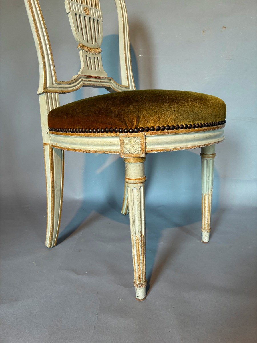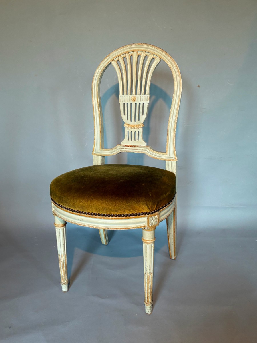 Suite de 6 chaises en bois de hêtre laqué crème et rechampi doré, reposant sur 2 pieds antérieurs fuselés, cannelés et rudentés et 2 pieds arrières en sabre.