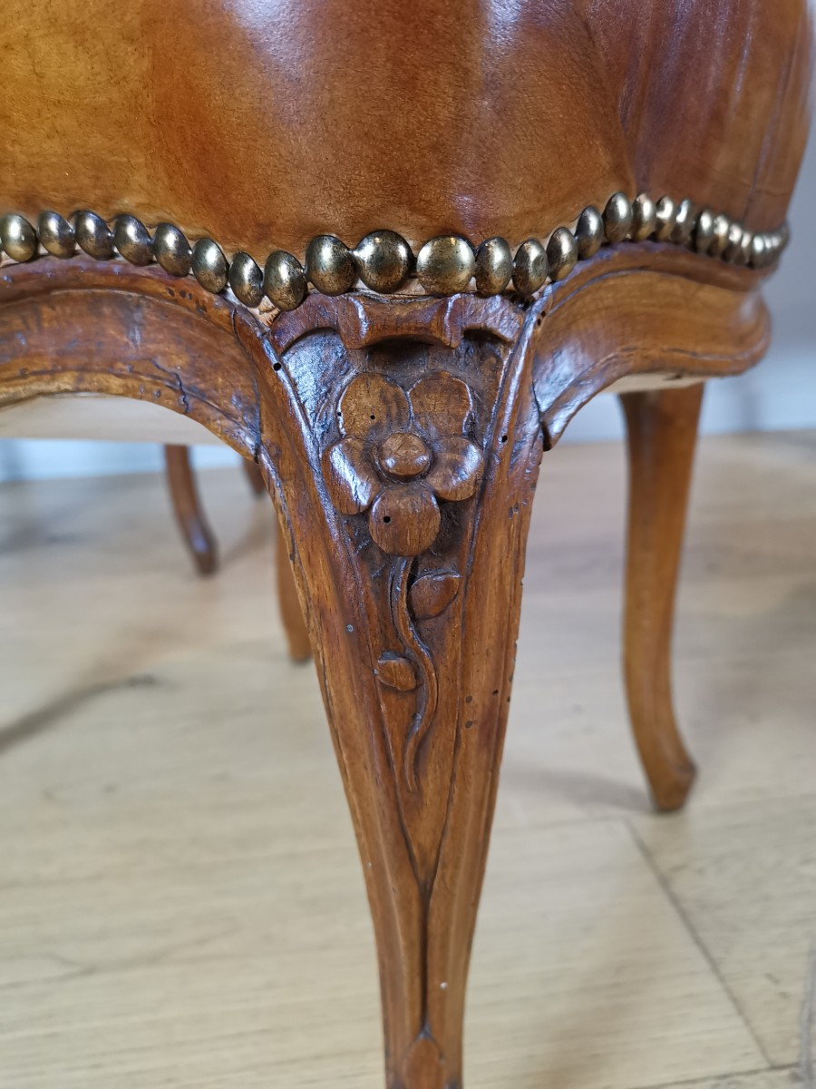 ... décoration toute florale des bouquets et des guirlandes de feuillages permettent de dater cette série de chaises parisiennes vers les années 1750-1755. Nous attirons votre attention sur la largeur et la profondeur des assises qui confèrent à ces chaises un parfait confort. Ces chaises ont fait l'objet d'une parfaite remise en état par l’ébéniste et le tapissier de leur propriétaire précédent; telles que la restauration totale des assises et des dossiers; soit le capitonnage, le sanglage et la couverture par un cuir de vachette. patiné de couleur havane ainsi que des collages et une enture. Toutes fois nous avons procédé à un traitement préventif car nous avons constaté de légères piqures et de ce fait un nouvel encaustiquage a été effectué. Dimensions: Hauteur 83.5cm, hauteur d’assise 45cm – Largeur d’assise 55cm.
