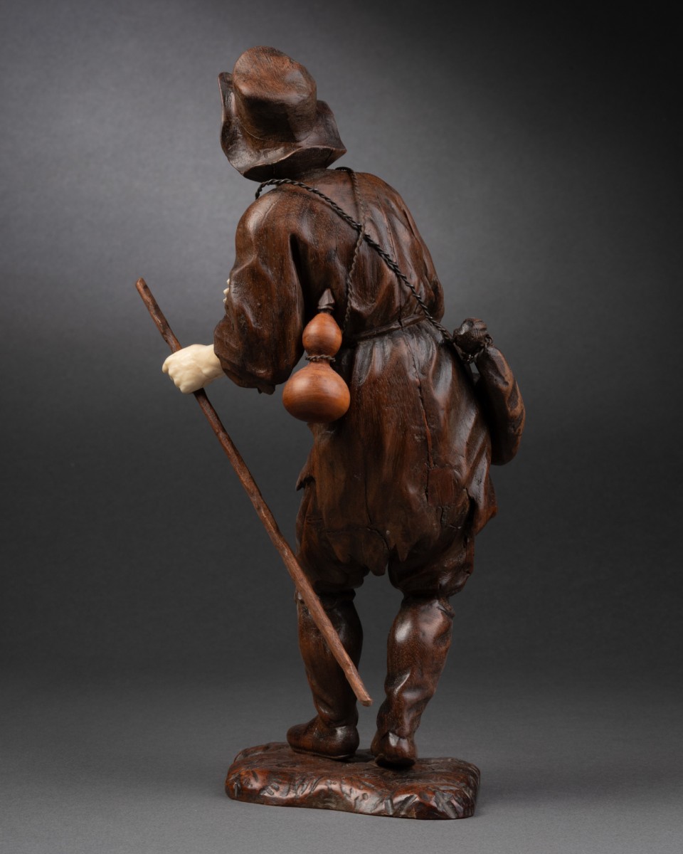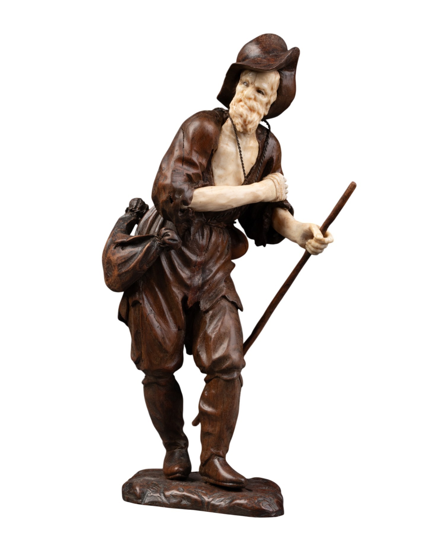 Figure émouvante d’un mendiant en marche, cette sculpture illustre à la perfection l’art subtil des suiveurs de Simon Troger (1683–1768), maître du contraste entre bois sombre et ivoire clair. Actif entre le Tyrol et Munich, Troger s’imposa au XVIII? siècle comme l’un des plus virtuoses sculpteurs d’Allemagne du Sud, renommé pour ses figures de vieillards, pèlerins et personnages populaires, où se mêlent naturalisme aigu et profondeur spirituelle.