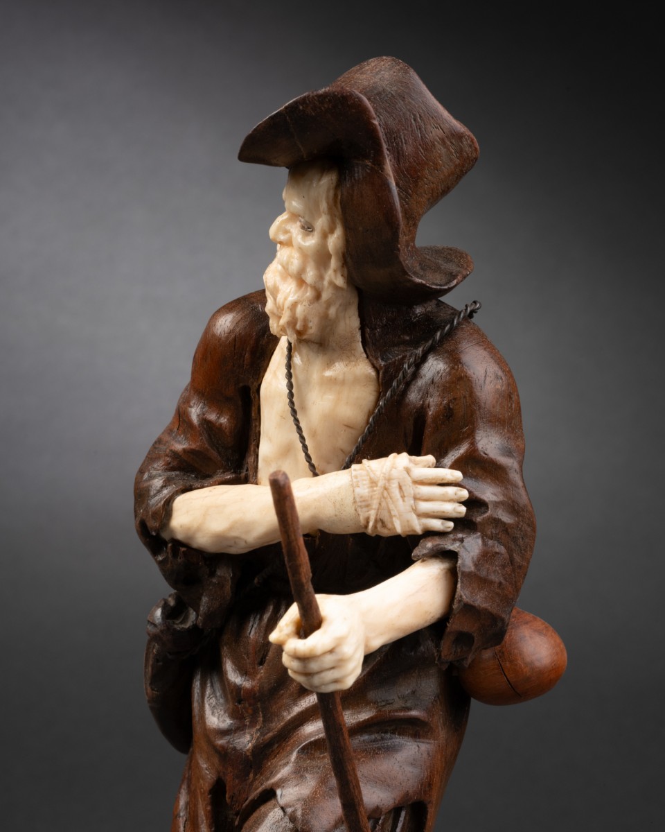 Dans le sillage de cette tradition, l’artiste anonyme déploie ici une science raffinée du modelé et du mouvement. Le visage, les mains et le bâton, taillés dans l’ivoire, se détachent avec éclat de la matière chaude et vibrante du bois fruitier. Cette opposition, chère à Troger, exprime moins un effet plastique qu’une métaphore morale : la tension entre la fragilité de la chair et la noblesse de l’âme, entre la pauvreté matérielle et la lumière intérieure.