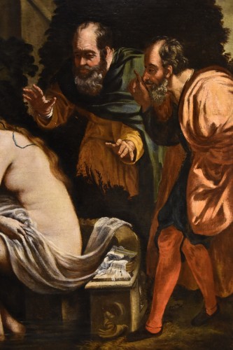 Ce précieux tableau illustre l'épisode piquant, tiré de l'Ancien Testament (Daniel, XIII), dans lequel la vertueuse Suzanne, fille mariée d'un riche juif, est surprise par deux vieillards, nouvellement élus juges, alors qu'elle se baigne dans le jardin de son palais. Devant son refus de céder aux désirs des anciens, ils la dénoncent en l'accusant faussement d'adultère, mais sont finalement démasqués pour leurs infâmes mensonges.