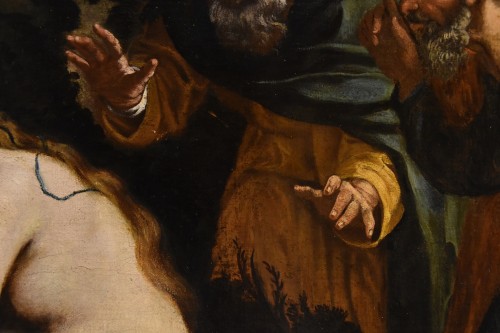 Dans cette œuvre, le peintre adhère à la culture figurative italienne typique du XVIe siècle, où les personnages masculins se trouvent à l'opposé de la jeune femme qui, dans son attitude énergique et contorsionnée, exprime la pudeur et la peur dramatique, représentant la division entre la justice et l'iniquité.