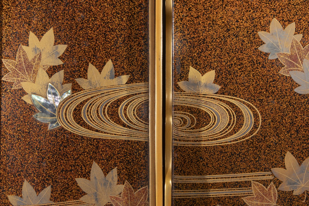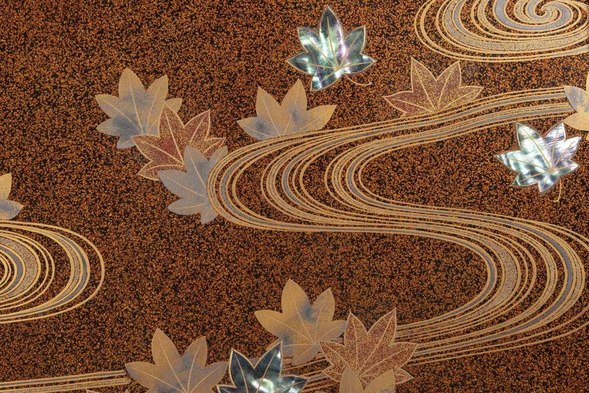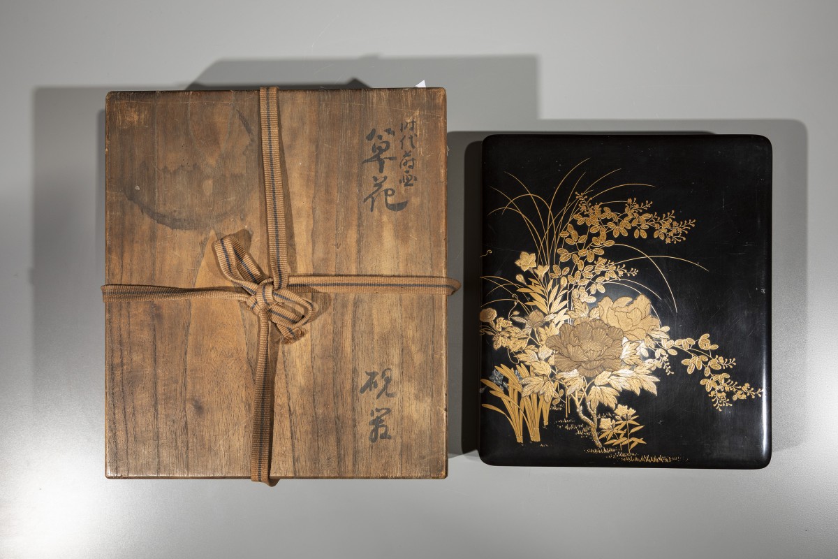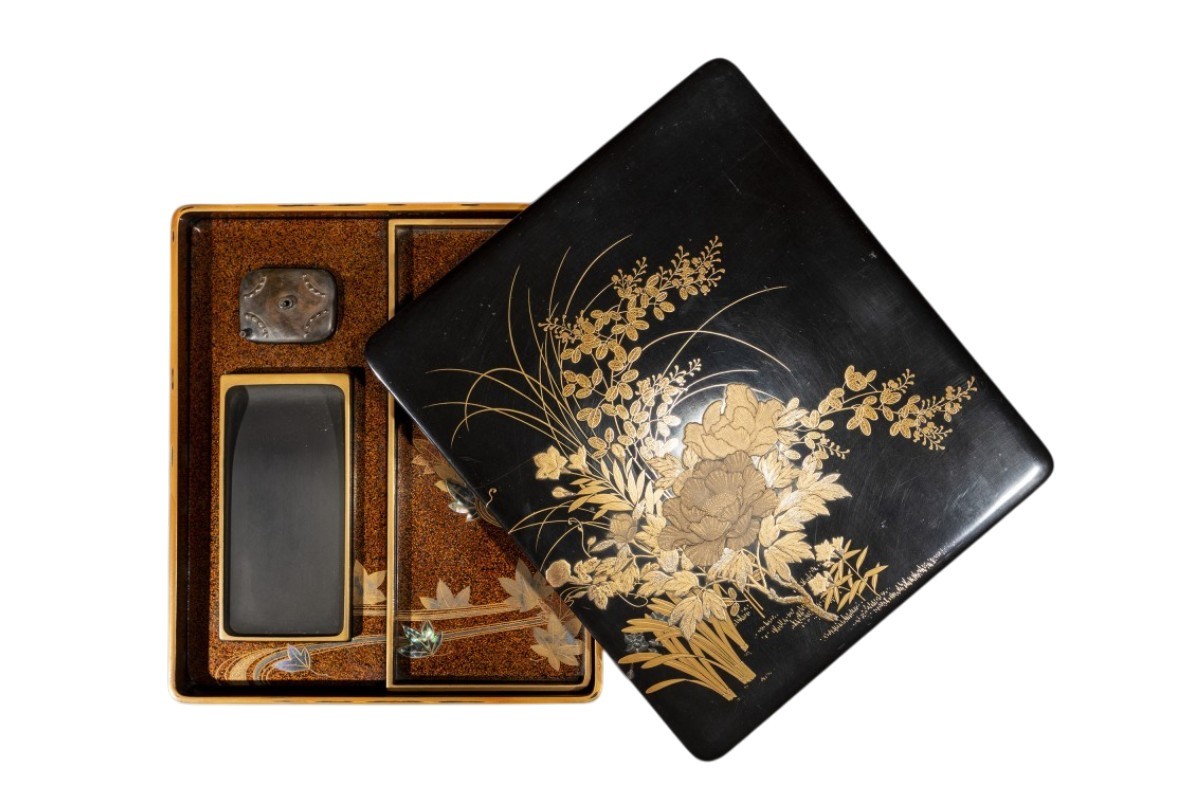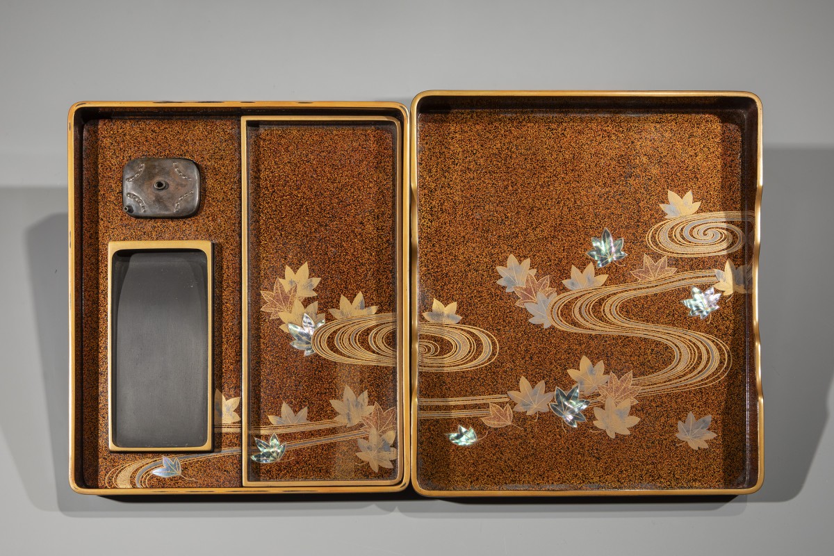 Suzuribako en laque décoré en maki-e en relief, représentant une composition florale de pivoines et d’iris réalisés en or sur un fond noir profond. Le décor présente des superpositions de laque et de poudre d’or, créant un délicat effet de relief et de profondeur dans la disposition des fleurs et des feuilles. L’intérieur est fini en laque nashiji, enrichie d’incrustations de nacre représentant des feuilles d’érable disposées le long d’un cours d’eau stylisé. Complet avec les éléments traditionnels du nécessaire d’écriture et son tomobako.
