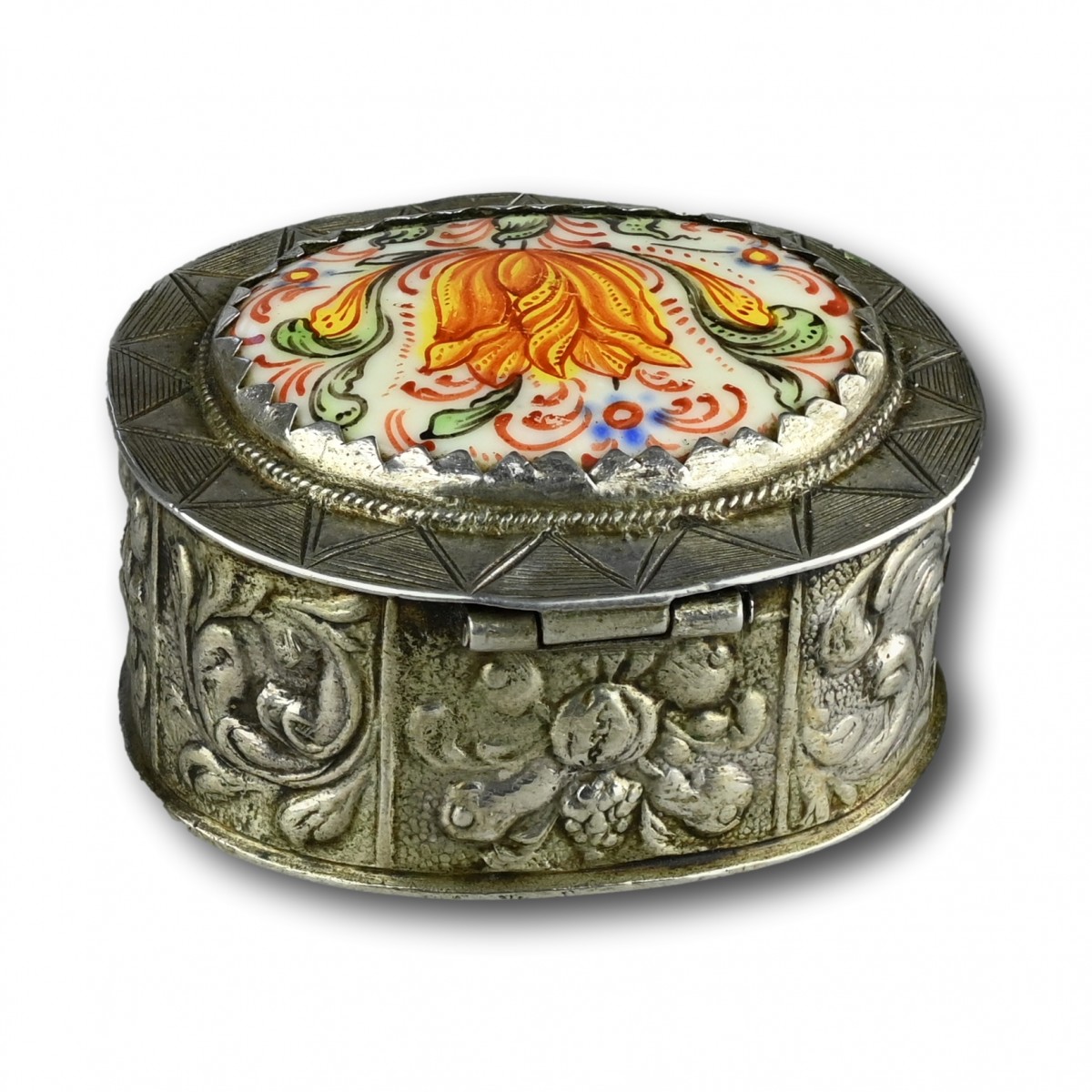 Le corps du coffret, non marqué, est décoré de rinceaux feuillagés et de bouquets chargés de fruits. Le couvercle de la boîte est serti d'une plaque décorée d'émaux polychromes et présente une tulipe orange vif entourée d'autres feuillages dans un décor en dents de chien.