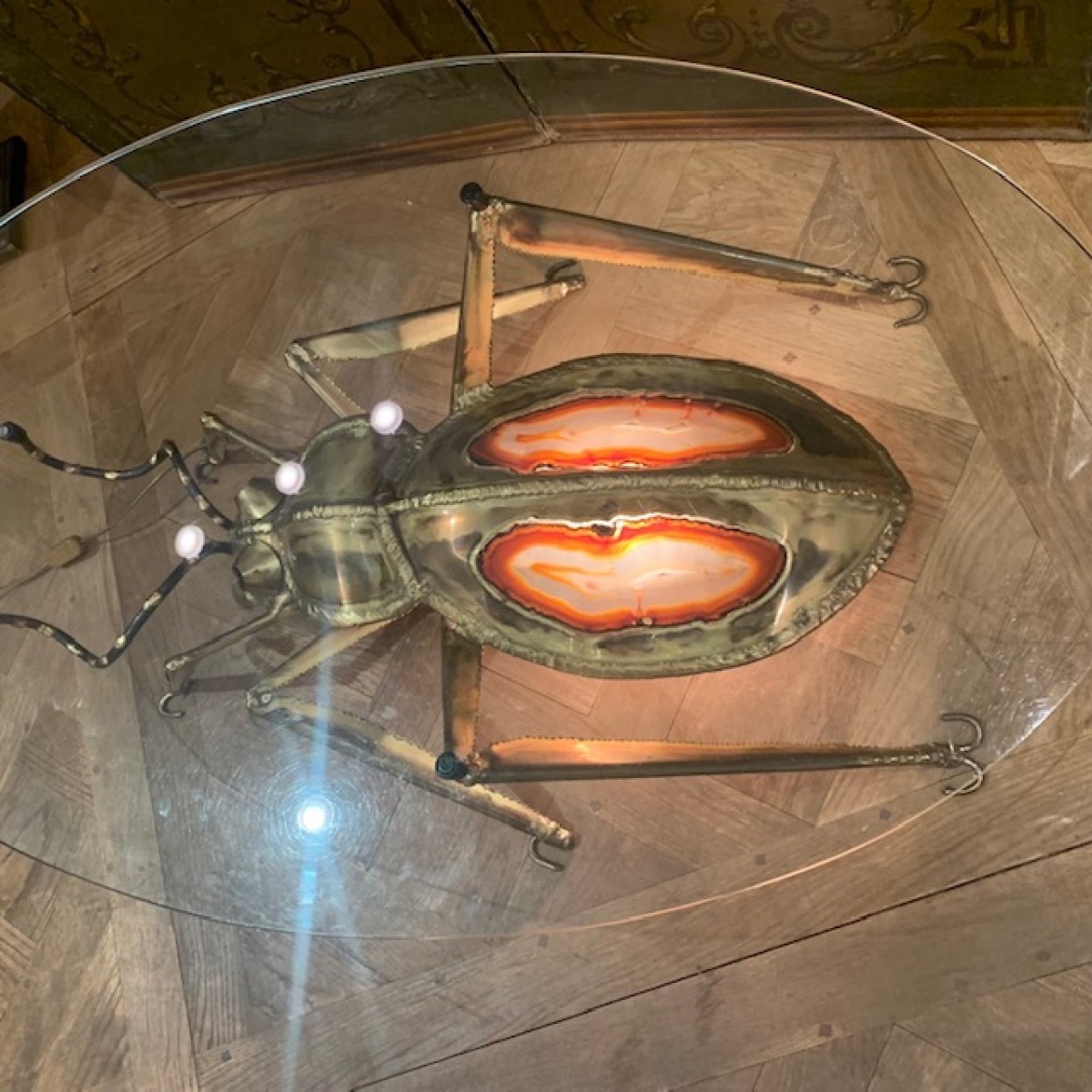 Table basse représentant un coléoptère en laiton avec 2 ailes en agathe assez importantes.Oeuvre attribuée à l artiste Jacques- Duval Brasseur artiste des années 1970 qui signe le retour du luxe décomplexé.