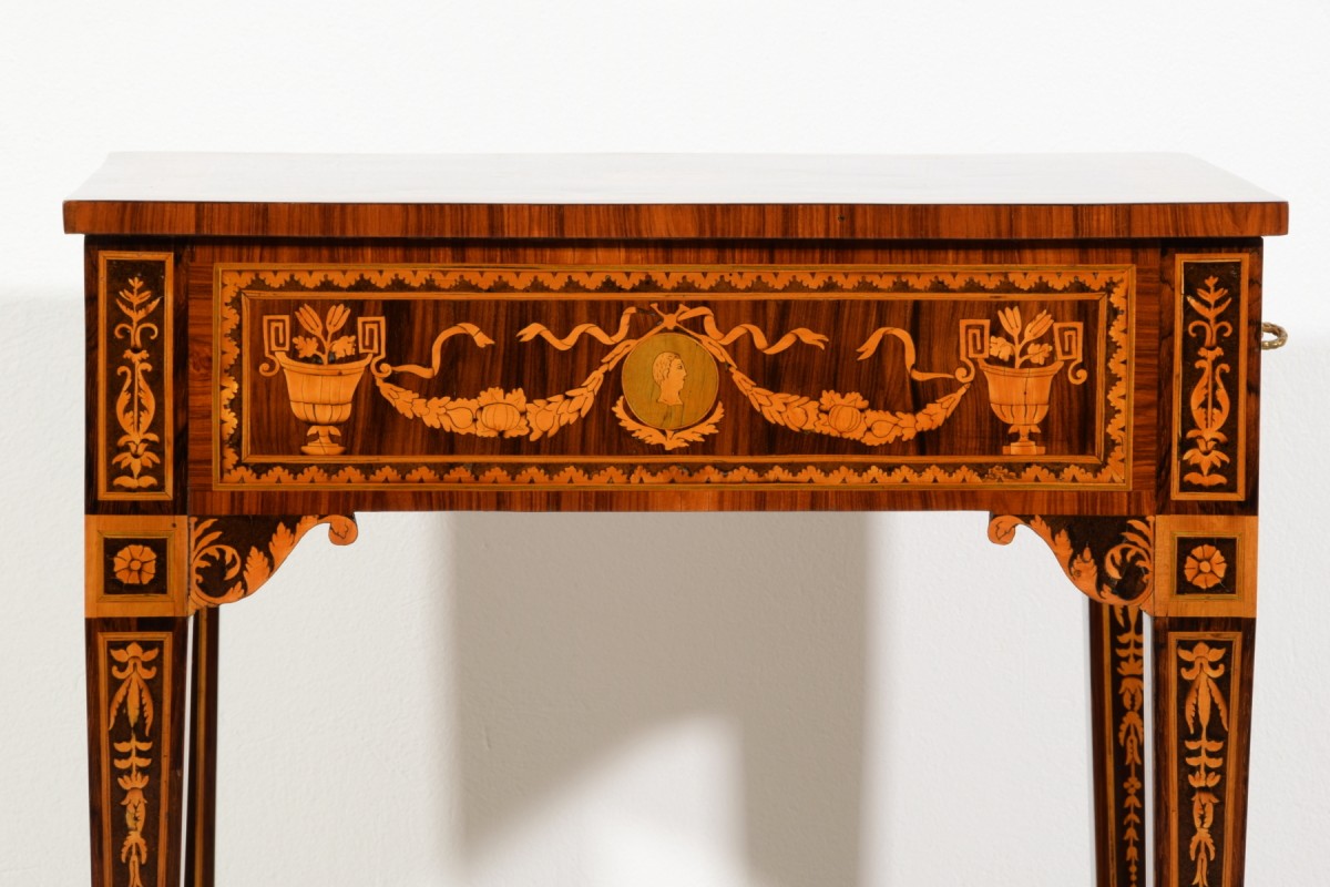 ... longs, un bouclier circulaire avec tête de profil. Sur le côté, il y a un tiroir avec serrure et clé en bronze. Le tiroir est réalisé en noyer massif, détail qui donne de la valeur en plus de faciliter le nettoyage de son intérieur. Les montants sont décorés de marqueterie avec des éléments naturels classiques. Les quatre jambes proviennent d’un élément en écrou décoré au centre d’une fleur et relié à la bande sous le plan par un élément en bois ondulé et incrusté. Les jambes sont en tronc de pyramide renversée, incrustées de motifs floraux, des quatre côtés.