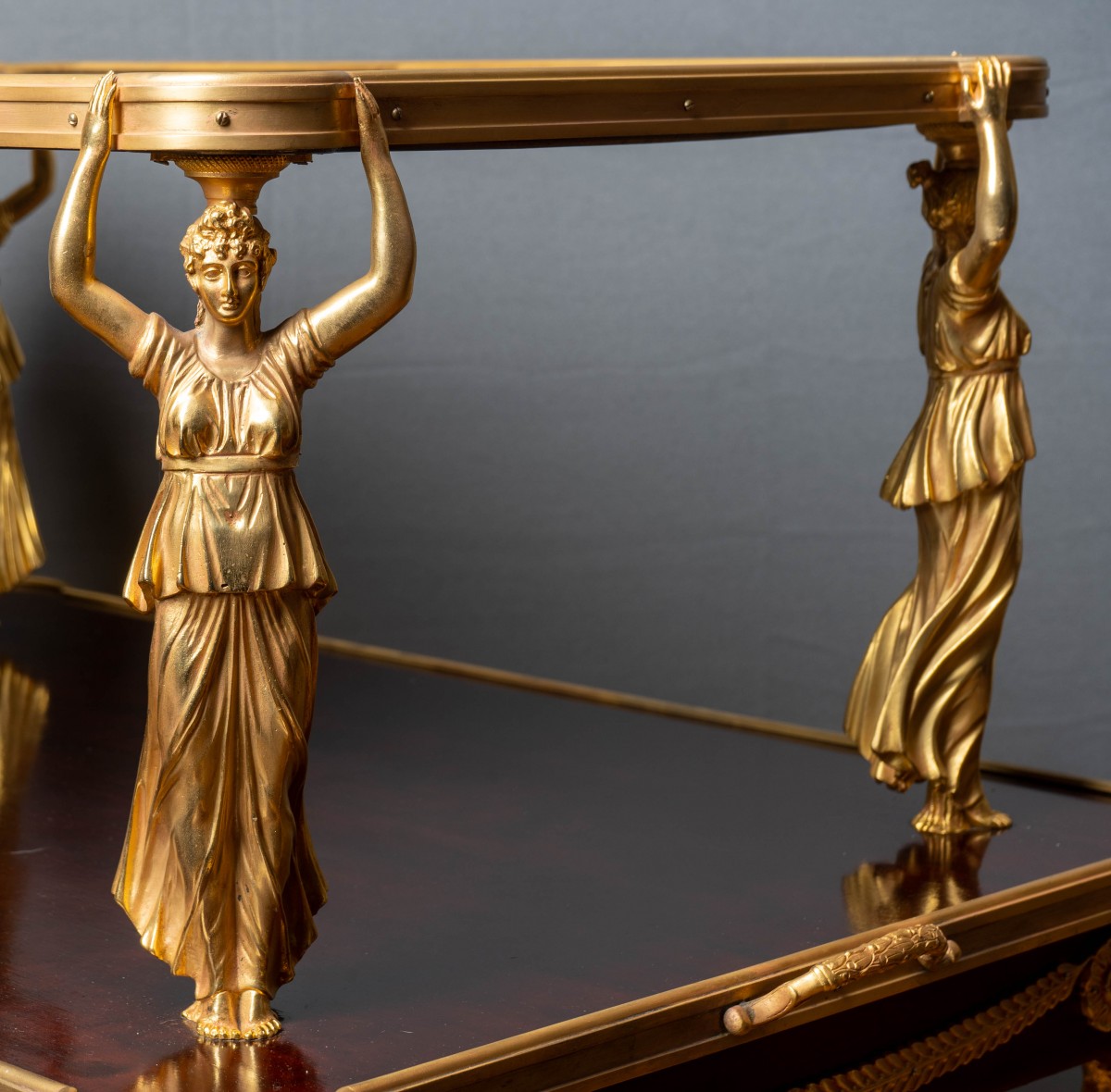 Une très élégante table à thé de style Empire en acajou monté en bronze doré, le niveau supérieur avec un sommet rectangulaire avec des coins arrondis évasés soutenus par quatre belles Victoires ailées cariatides en bronze doré tournées vers l'extérieur portant des robes diaphanes, levant leurs mains pour tenir le sommet, les cariatides sont debout sur le sommet du niveau inférieur, qui a un sommet de forme conforme au-dessus d'une frise montée avec des couronnes et des guirlandes de feuilles de laurier, avec des étoiles à chaque coin au-dessus de chapiteaux à masque d'Apollon, des pieds de tête effilés qui se terminent par des sabots enveloppés de feuillage et des pieds en roulette.