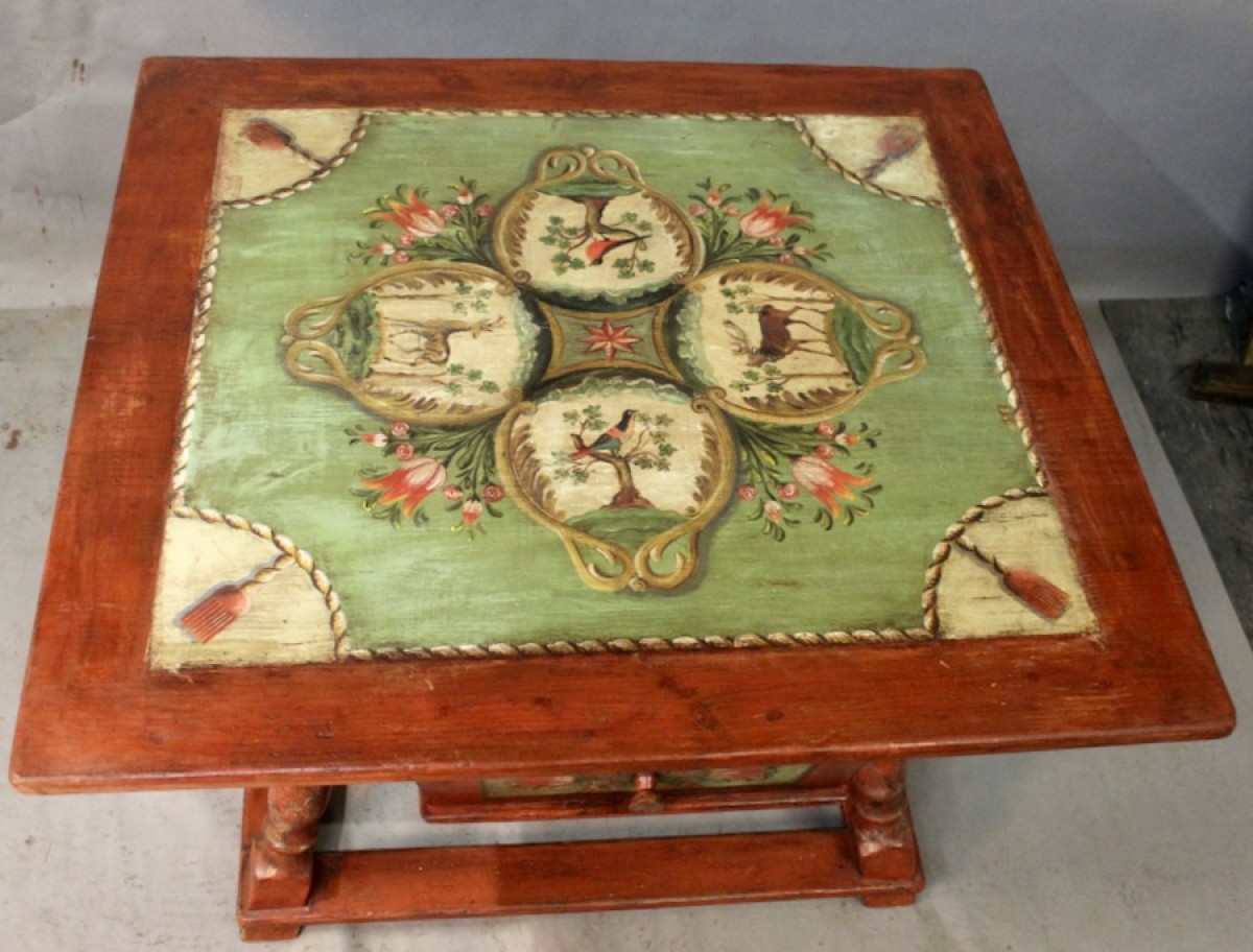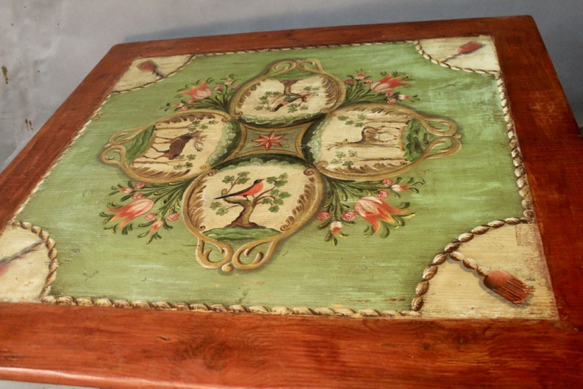 Table rectangulaire en conifère avec plateau peint à décor de cerf, daim et oiseaux dans des réserves, fleurs et cordons.
