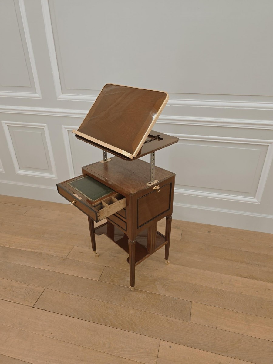 Table chiffonnière à Tronchin en acajou massif et placage. Elle repose sur quatre pieds fuselés et ouvre par trois tiroirs en façade laissant apparaître un écritoire gainé de cuir Le plateau se soulève en deux parties soutenues par des crémaillères. Estampillée Joseph Gengenbach dit Canabas (1715-1797) – maîtrise obtenue le 1 avril 1766 : D’origine allemande, Canabas - de son vrai nom Joseph Gengenbach - arrive à Paris dans les années 1740. À la fois ébéniste et menuisier, il utilise aussi bien le placage que le bois massif.