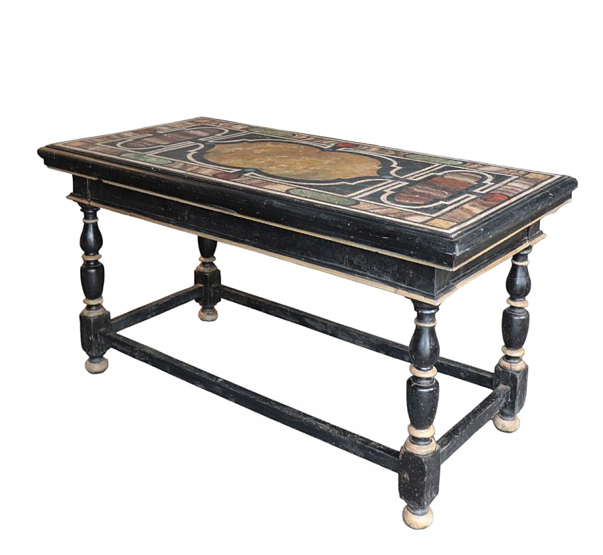 Table console laquée avec marbres, Toscane, années 700 Grande table en bois avec des pieds en bobine et des traverses et un plateau laqué avec des imitations de marbres. Pièce centrale pouvant être utilisée comme table console.