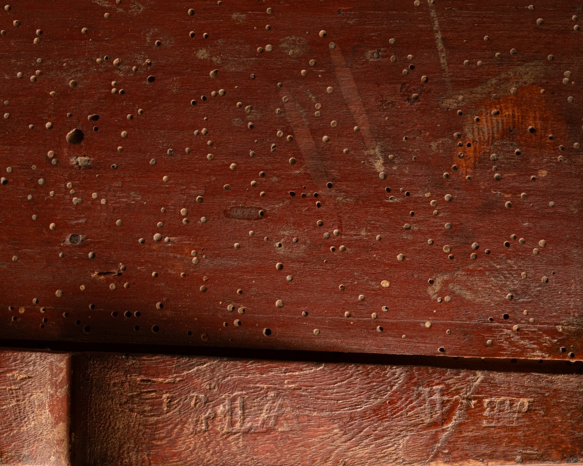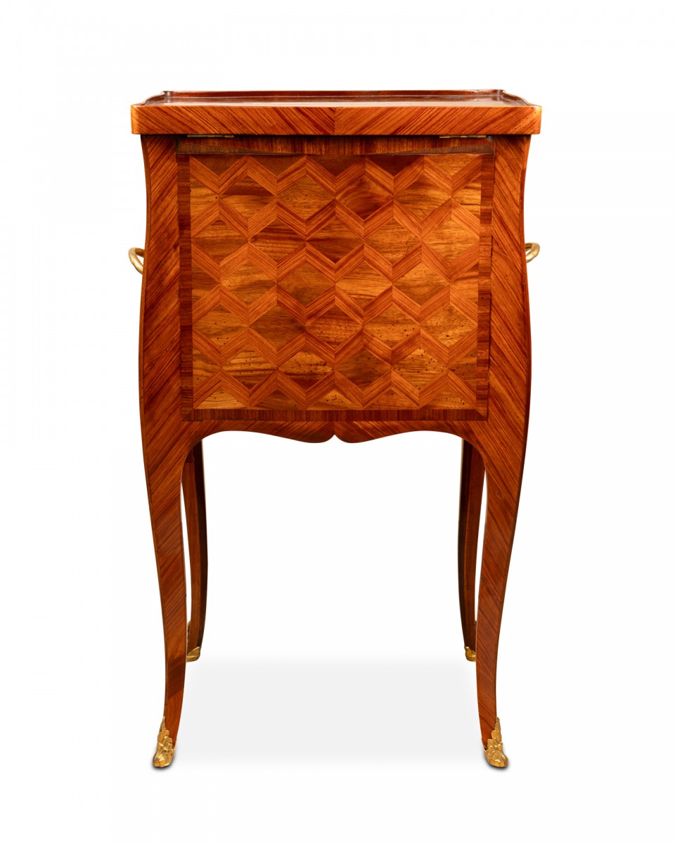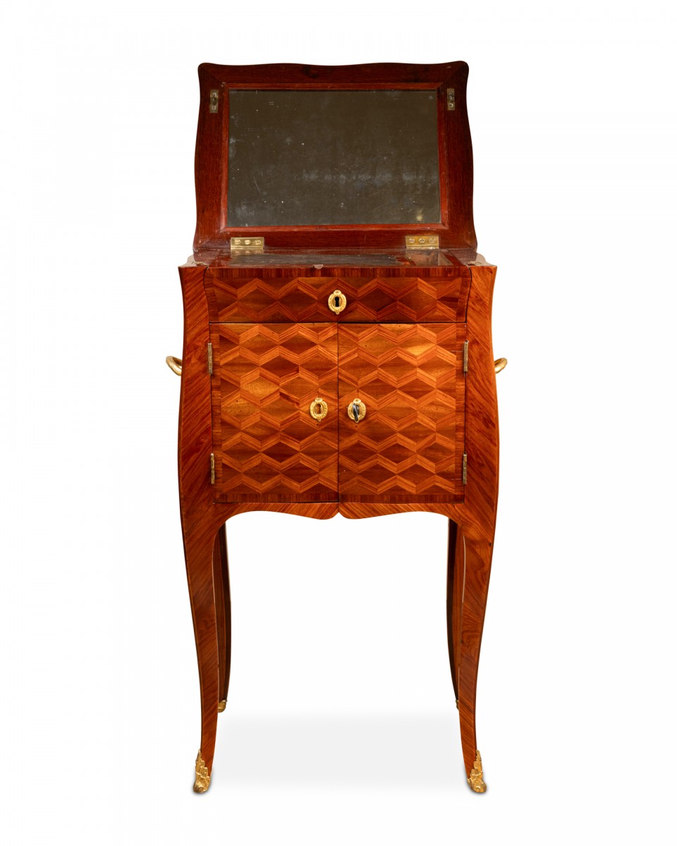 En bois de rose, satiné, amarante et ornementation de bronze ciselé et doré, à décor de marqueterie géométrique, le dessus chantourné se soulevant et découvrant, grâce à deux boutons poussoirs, un miroir et un écritoire gainé de cuir vert formant tiroir, la façade ouvrant par deux portes présentant deux tiroirs postérieurs et un casier, les côtés à poignées, sur des pieds cambrés terminés en feuilles d'acanthe, estampillée deux fois 'ARMAND' et 'JME' sur la traverse arrière