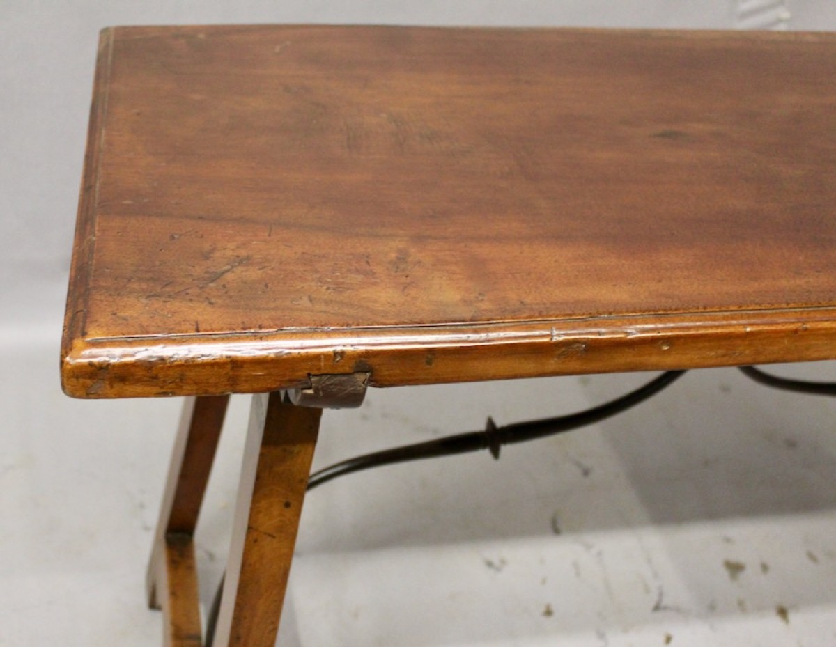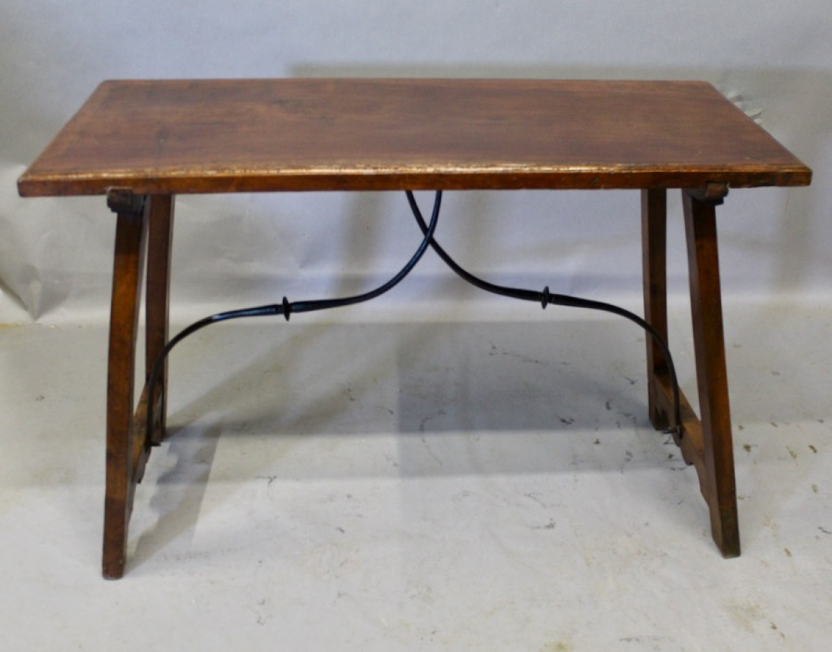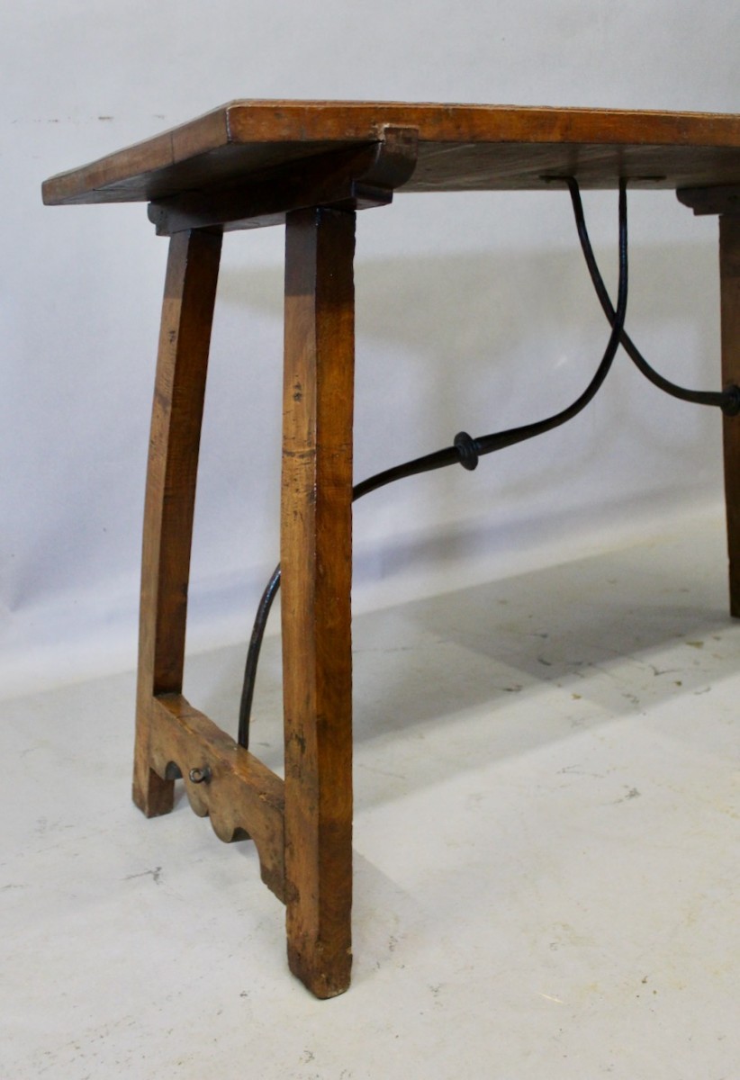 Elégante table espagnole en noyer massif,reposant sur deux pieds droits réunis par une entretoise en fer forgé en accolade,