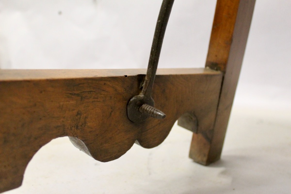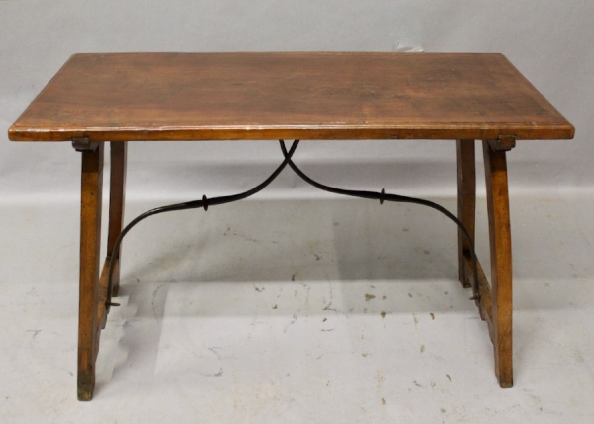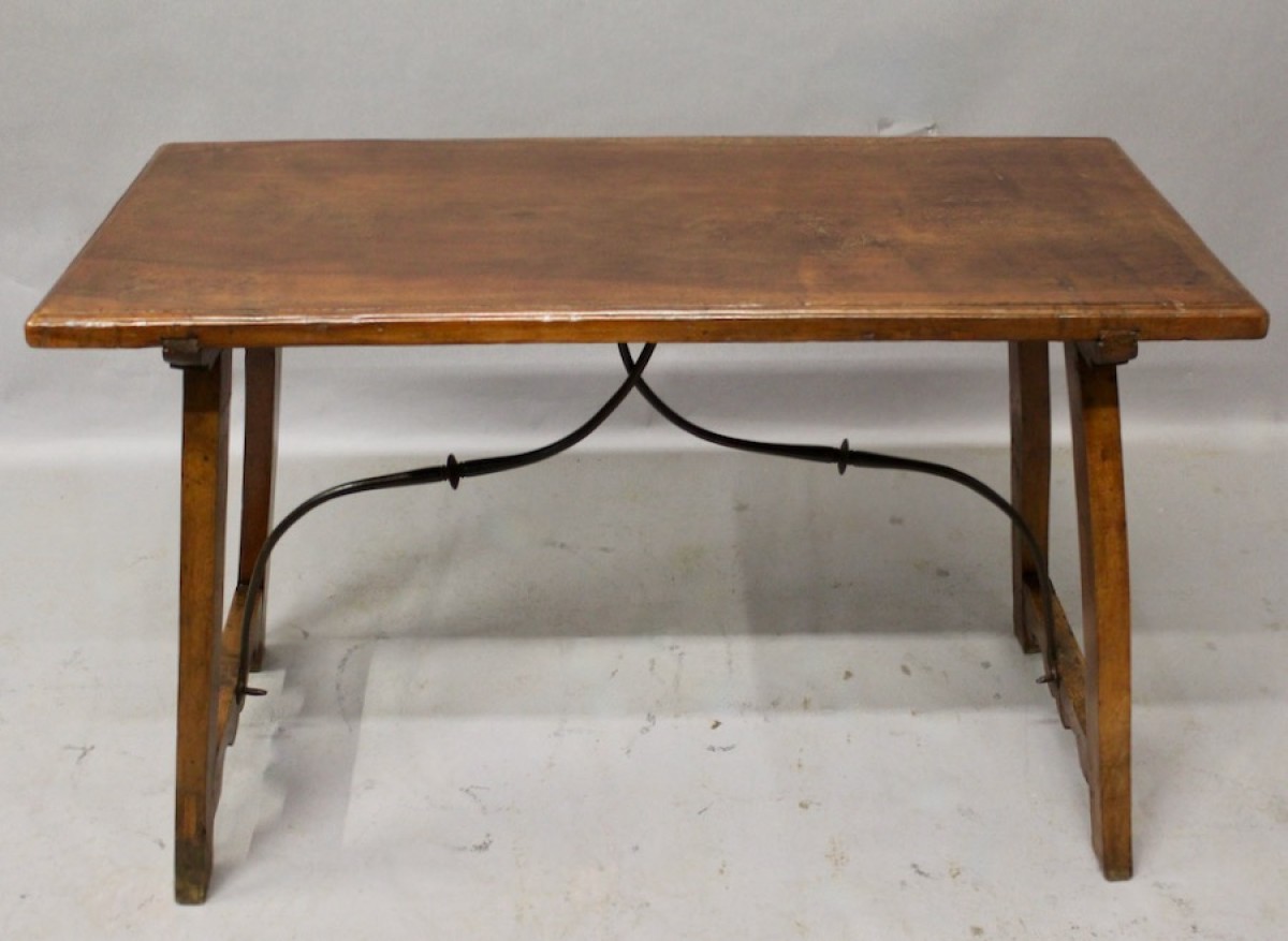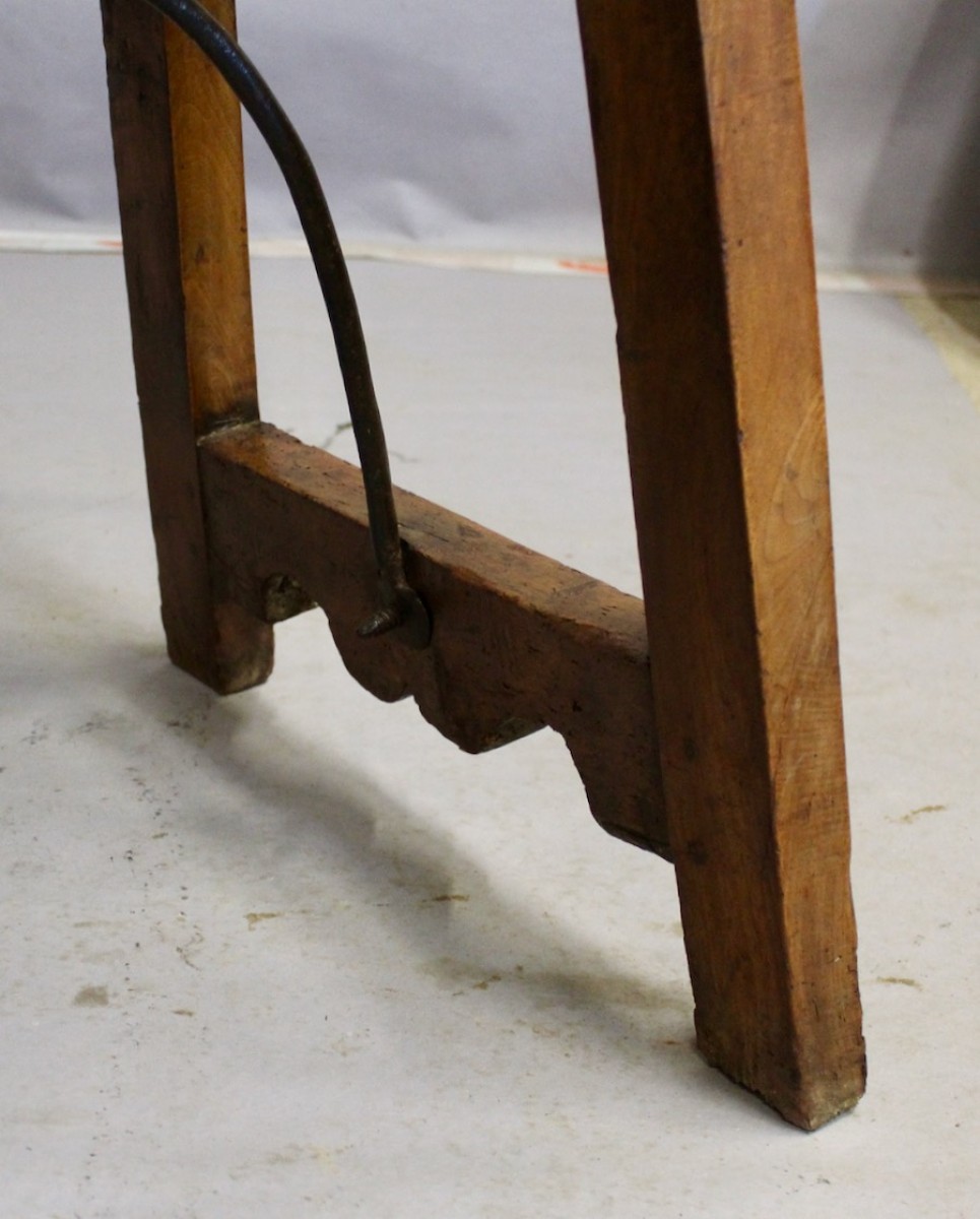 Elégante table espagnole en noyer massif,reposant sur deux pieds droits réunis par une entretoise en fer forgé en accolade,