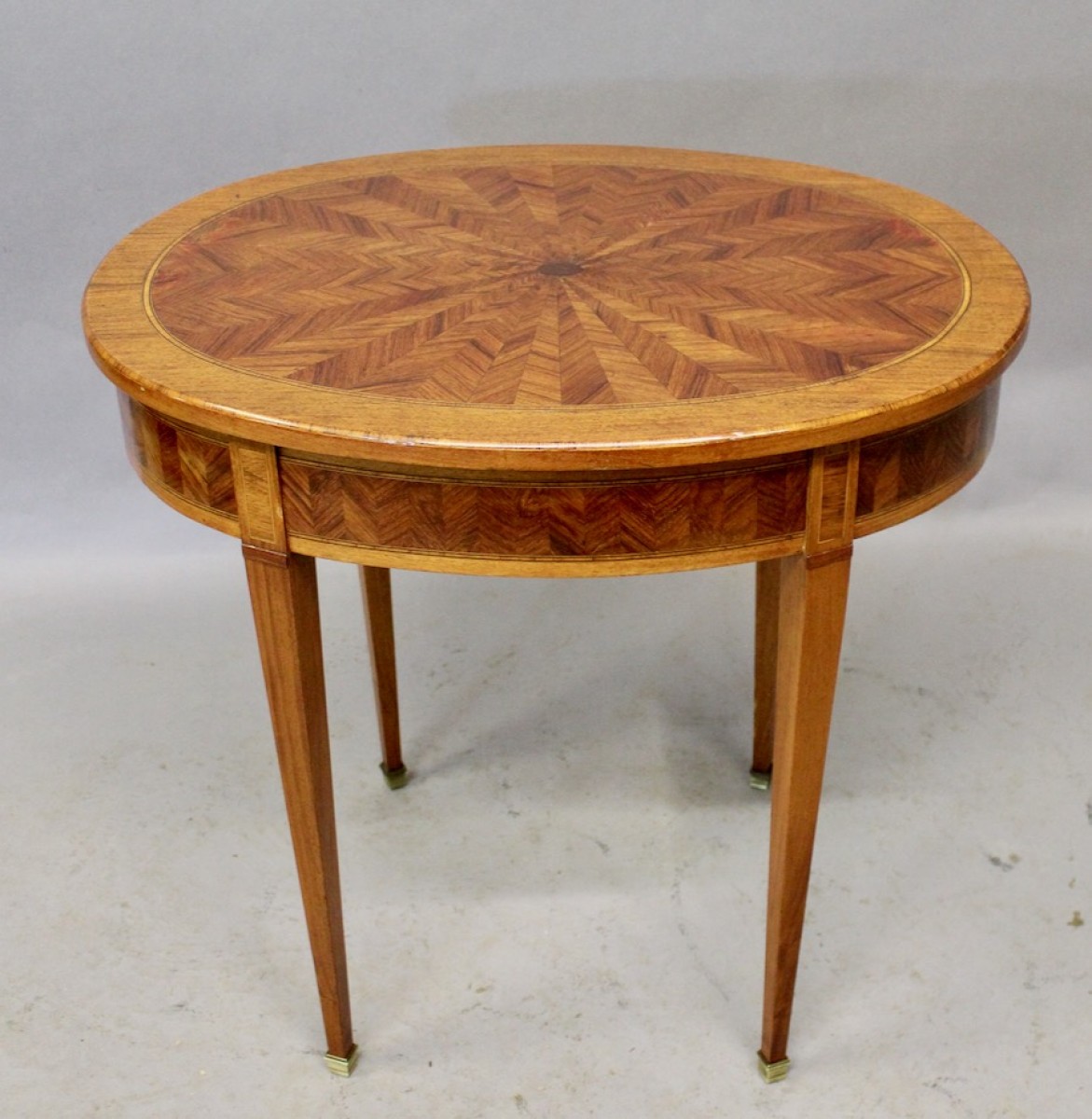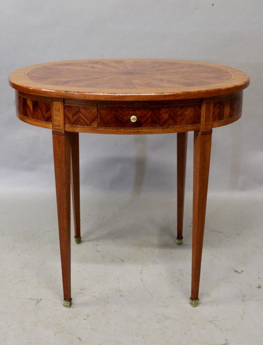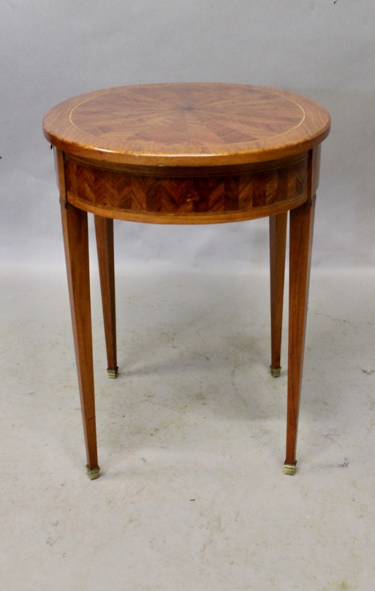 Table Guéridon Louis XVI en marqueterie à un tiroir en ceinture.