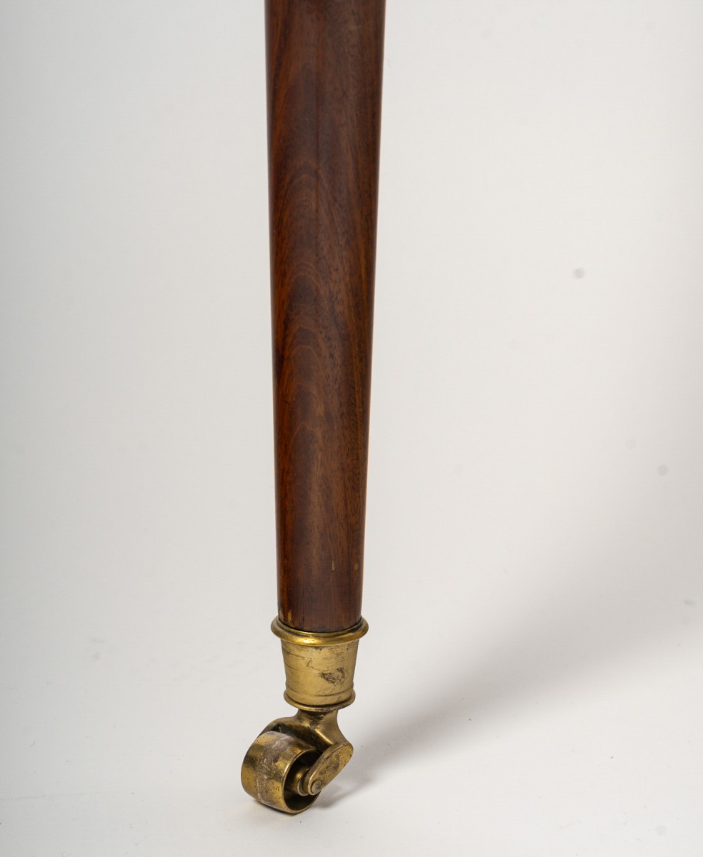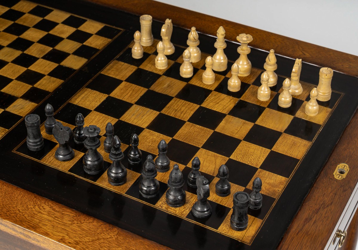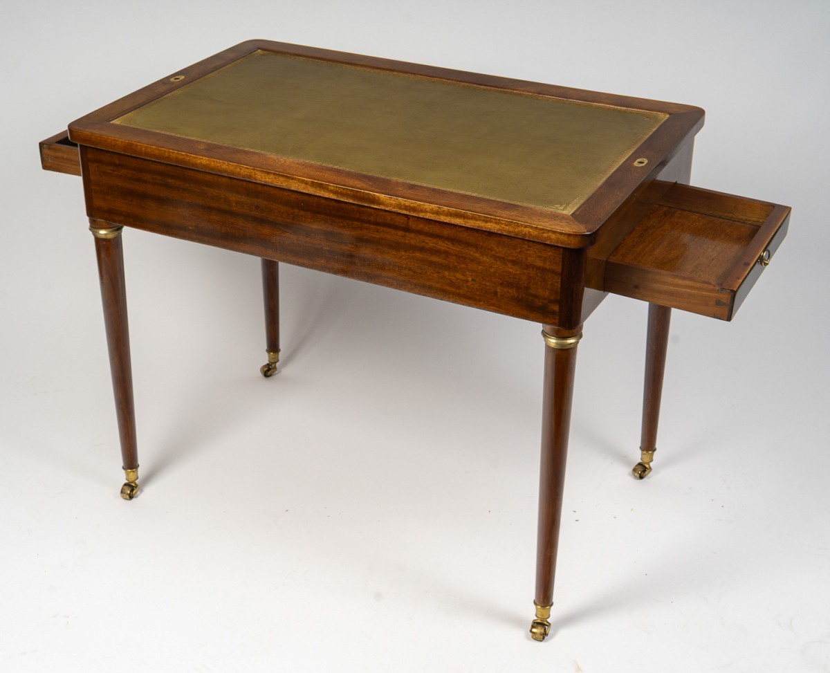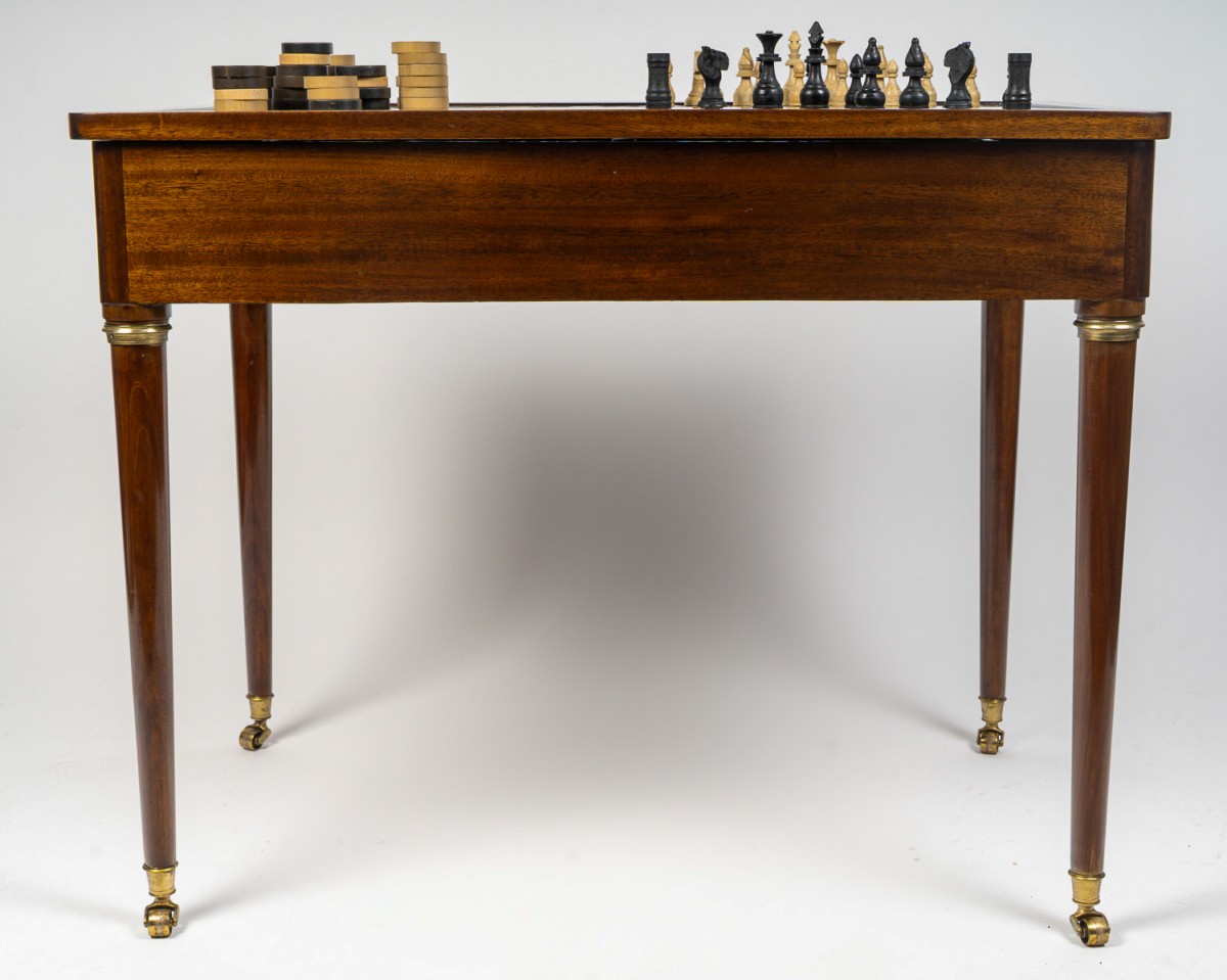 Son dessus, amovible, révèle deux faces : l’une ornée de deux damiers en marqueterie, dédiés respectivement aux jeux de Dames et d’Échecs ; l’autre, servant de bureau, est garnie d’un cuir vert tilleul rehaussé de motifs Louis XVI à la roulette dorée. Une fois le plateau retiré, un jeu de Tric-Trac apparaît, agrémenté d’incrustations d’os et de sycomore teinté vert sur un fond d’ébène. Deux tiroirs latéraux complètent l’ensemble, tandis que quatre pieds fuselés, terminés par des roulettes en bronze doré, assurent stabilité et élégance.