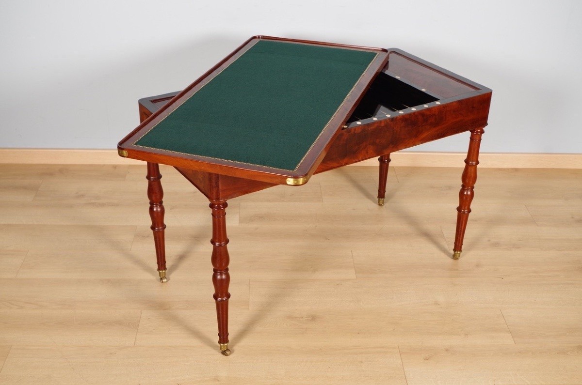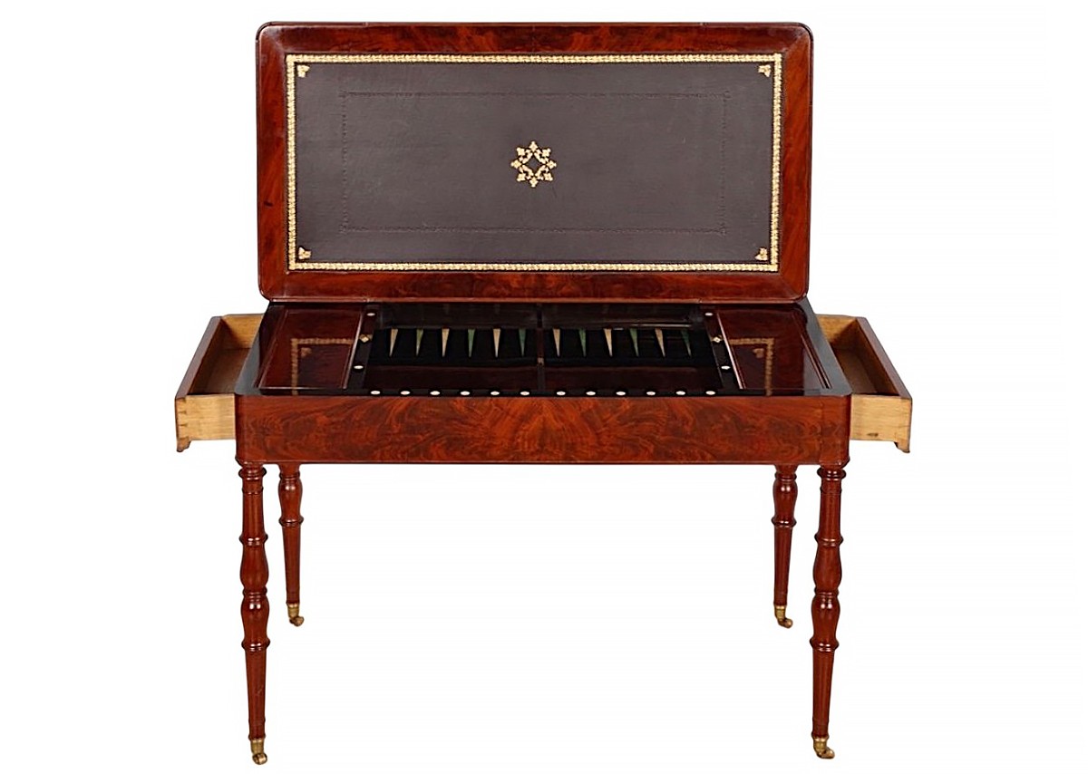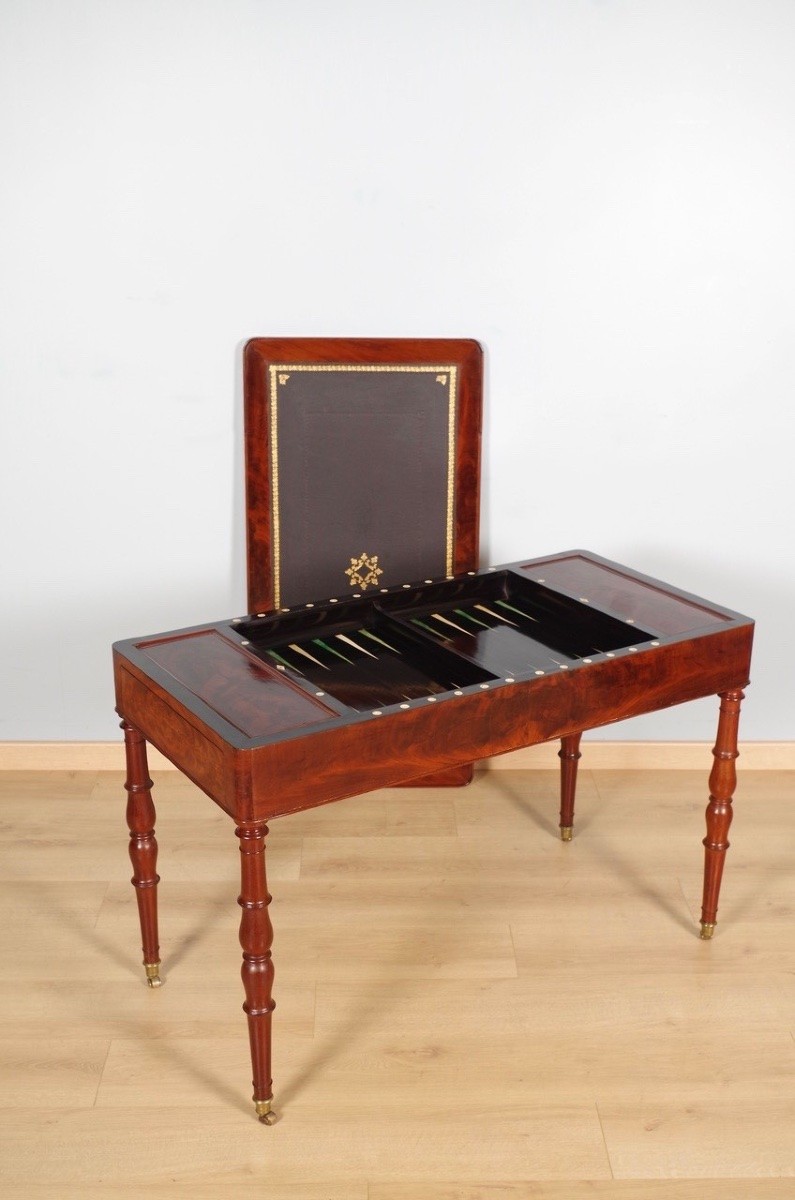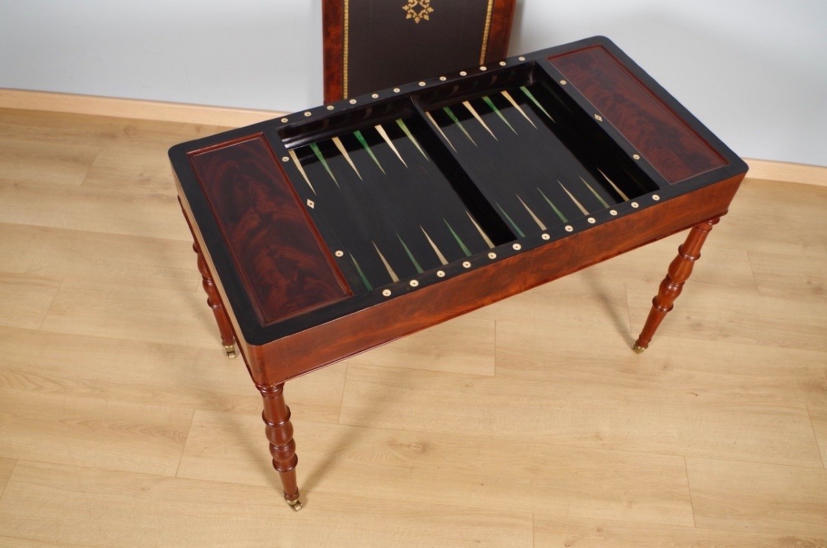 Table Tric Trac en acajou et placage de ronce d’acajou.