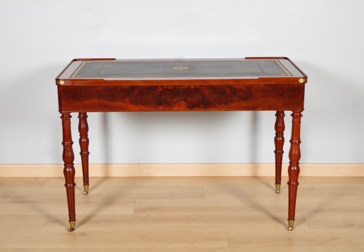 Elle ouvre à deux tiroirs opposés et repose sur quatre pieds «Jacob» terminés par des sabots en bronze doré à roulette.