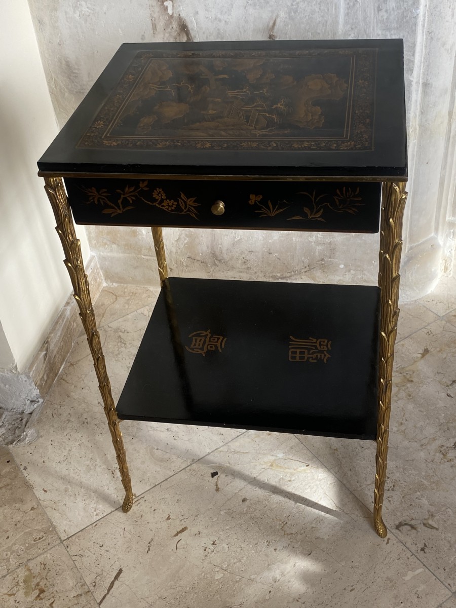 Table avec montants en bronze doré décor palmier avec plateaux en bois laque de chine à décor de paysage,personnages,montagne, riviére