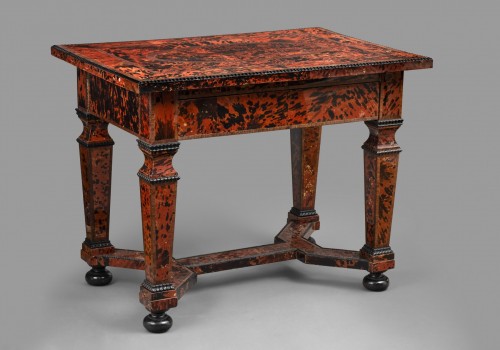 Une très rare table centrale anglo-hollandaise en placage d'écaille de tortue teintée rouge et de bois de violette, le plateau rectangulaire avec un bord mouluré ondulé et une incrustation géométrique ; au-dessus d'un tiroir en frise et des pieds carrés effilés reliés par une entretoise en H sur des pieds noircis.