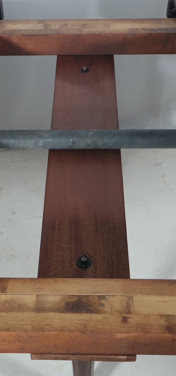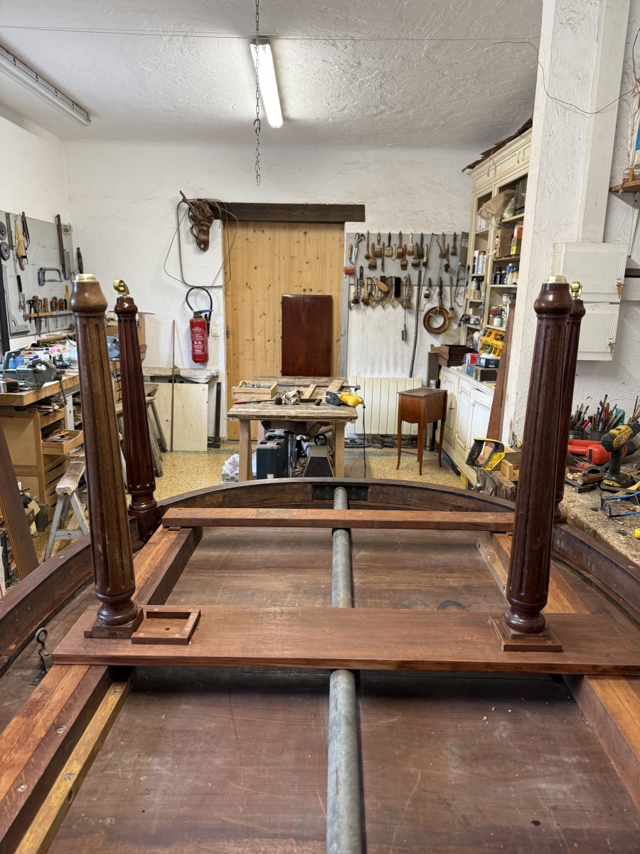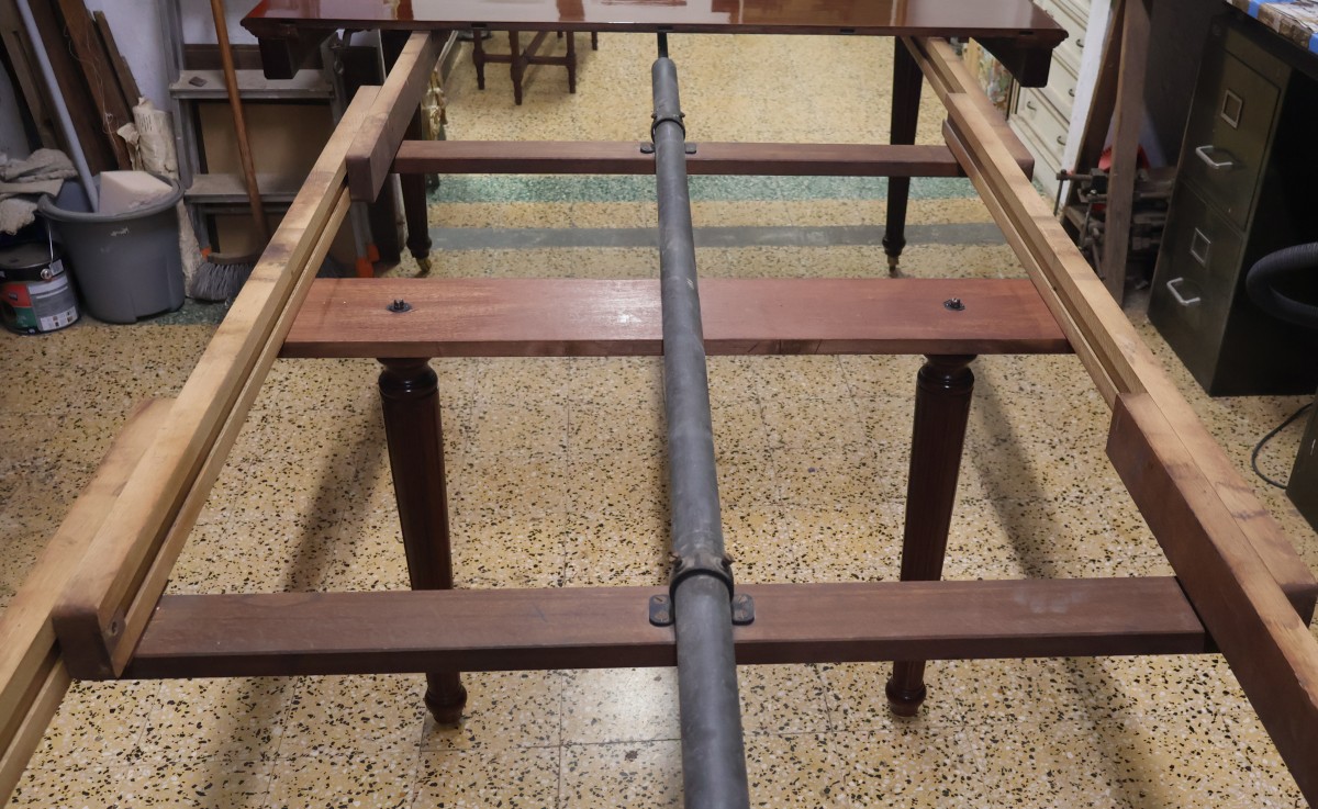 Elle s’ouvre à l’aide d’une manivelle permettant d’accueillir quatre allonges supplémentaires postérieures : deux de 30 cm , une de 45 cm et une de 43 cm offrant ainsi une longueur totale de 3,95 m ainsi que 2 pieds amovibles