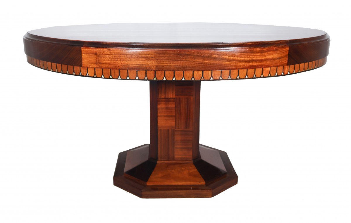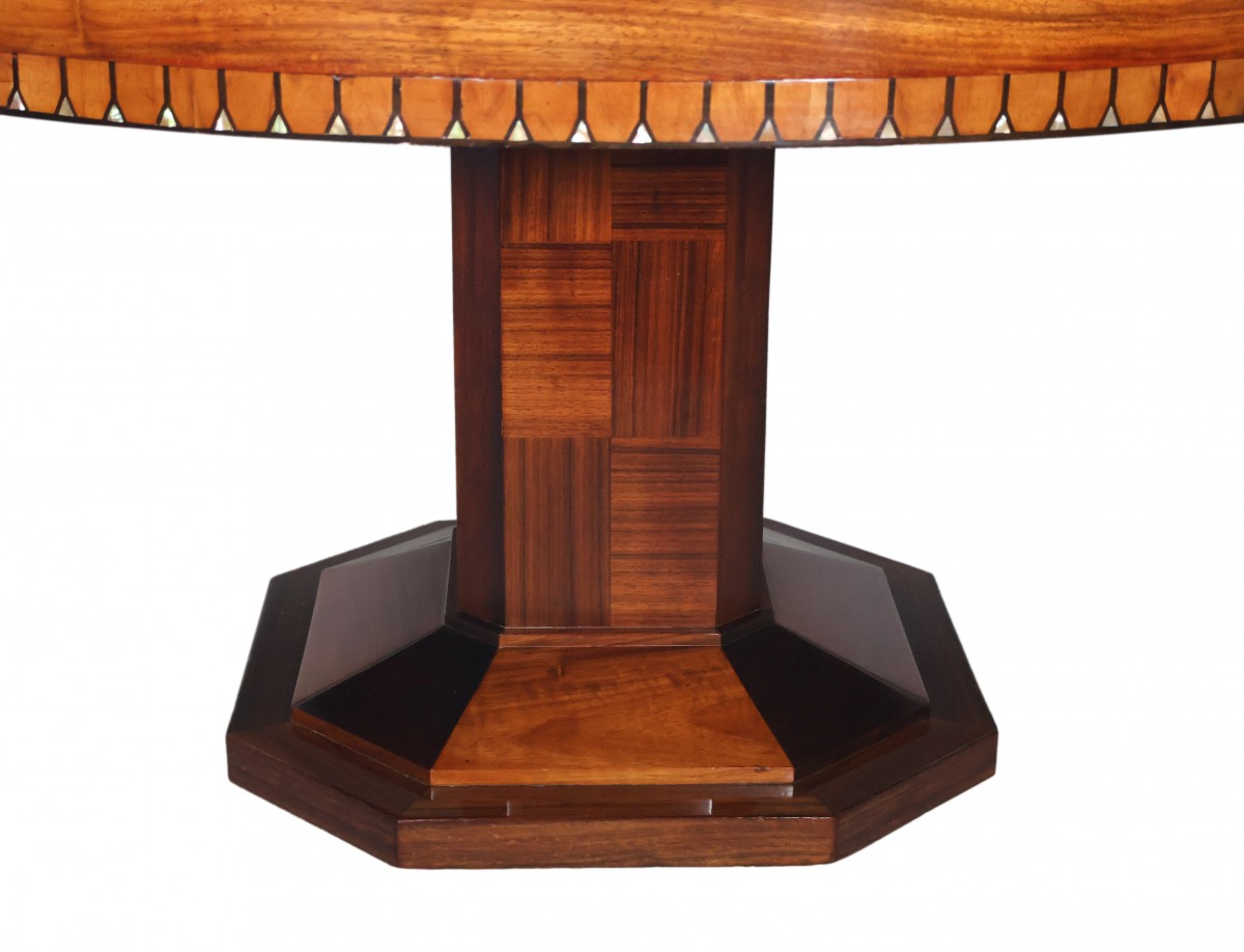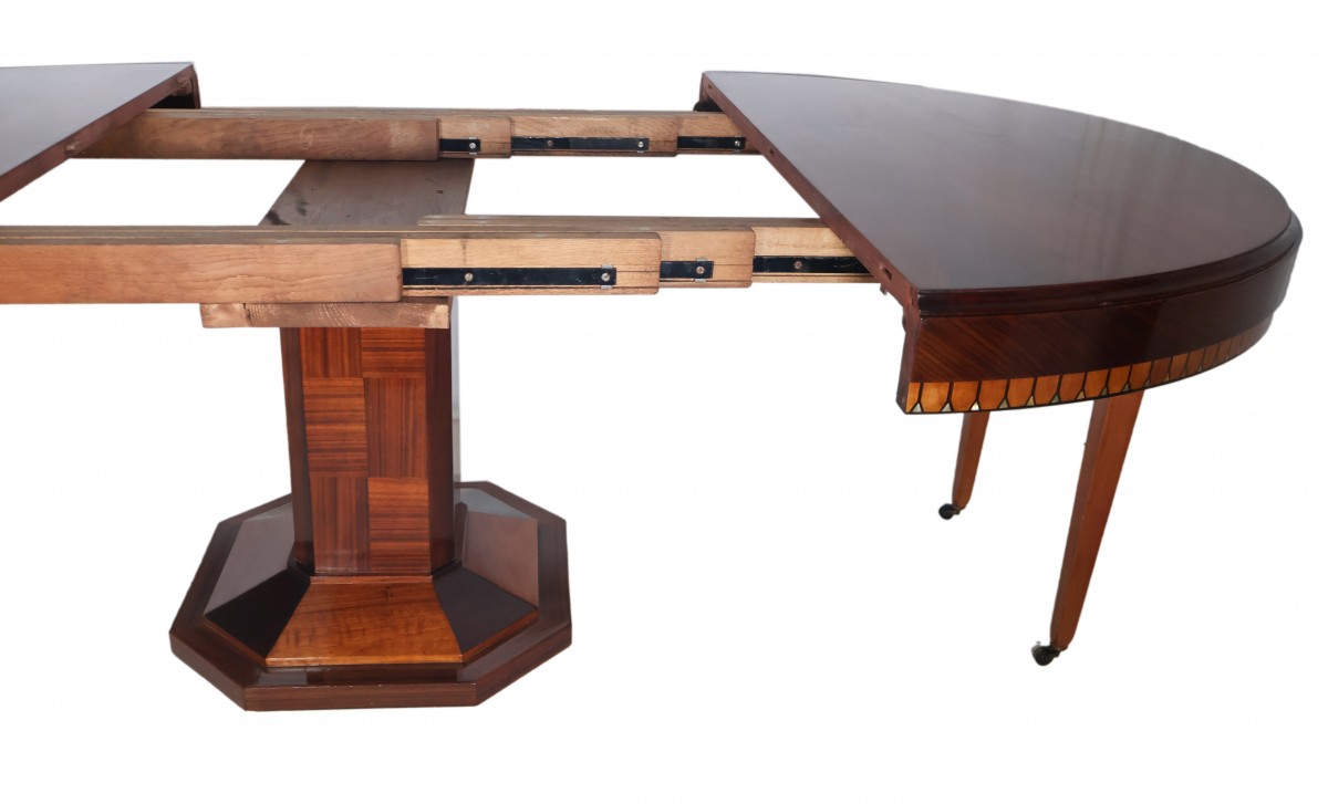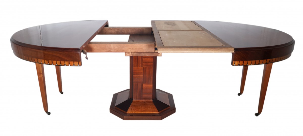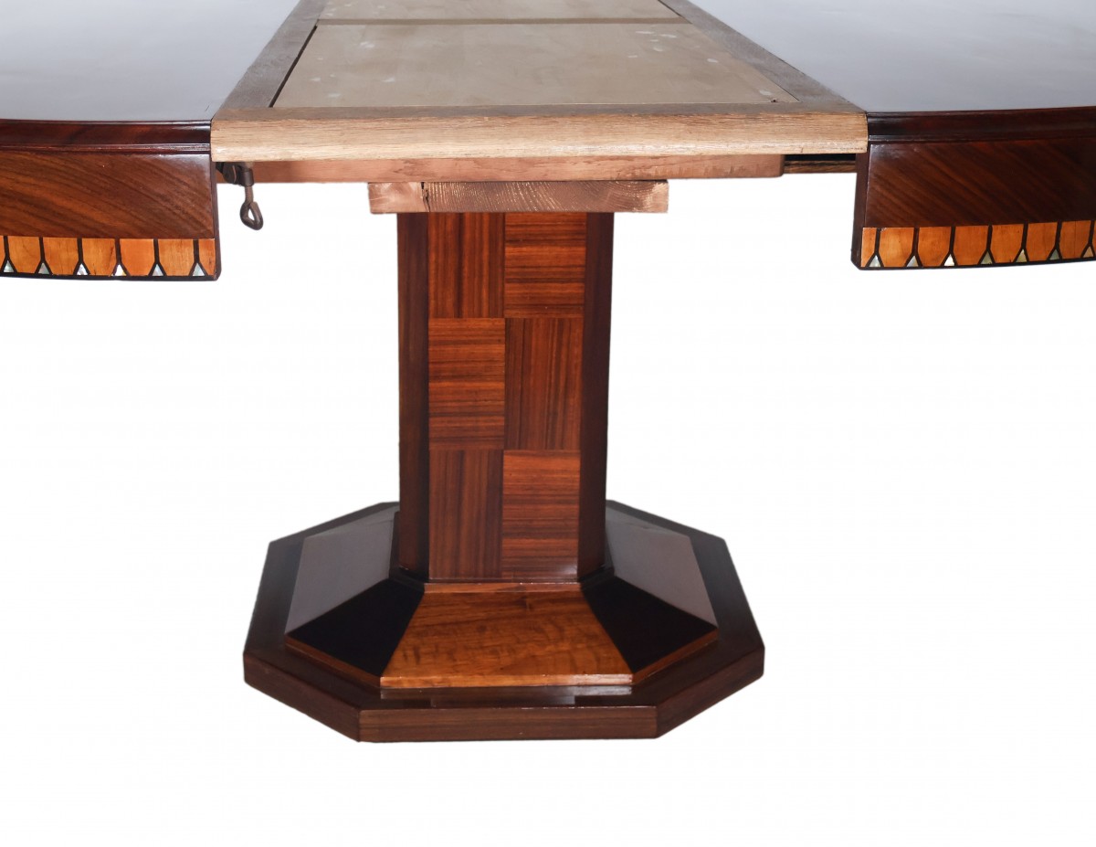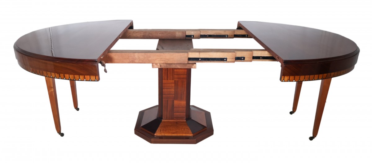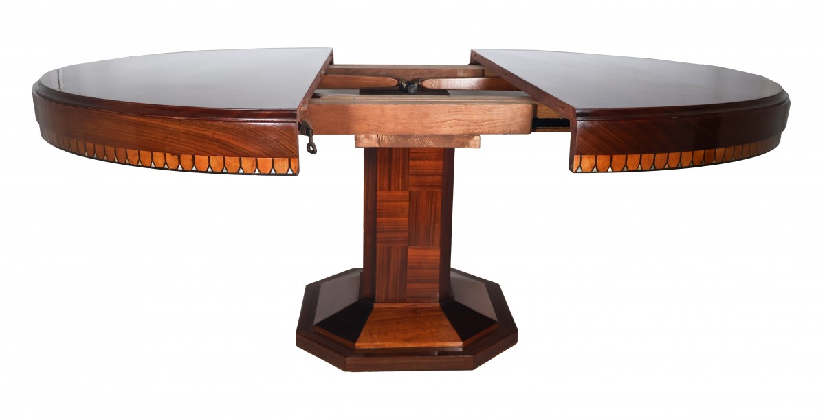 Table ronde à rallonges en acajou et palissandre, époque Art déco.