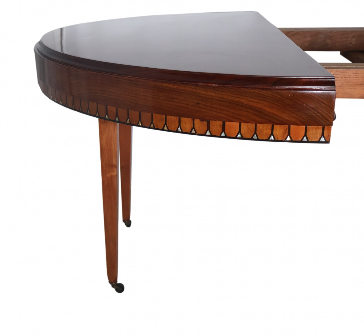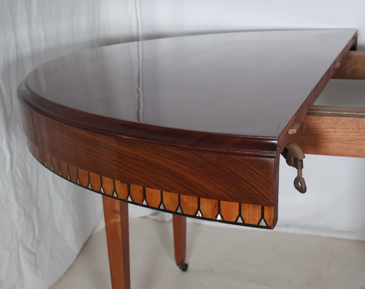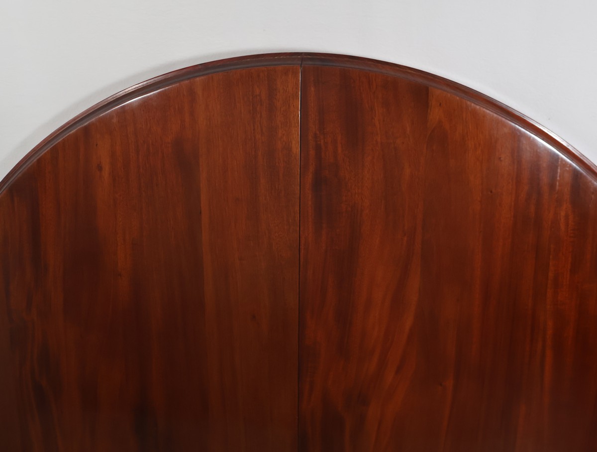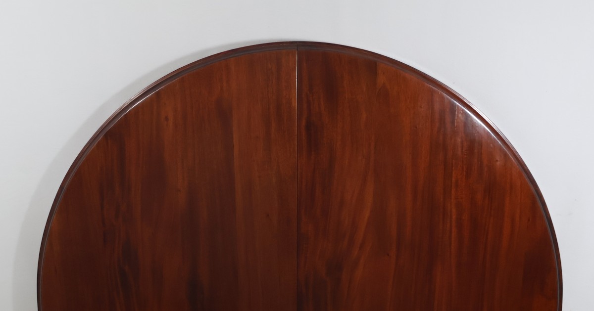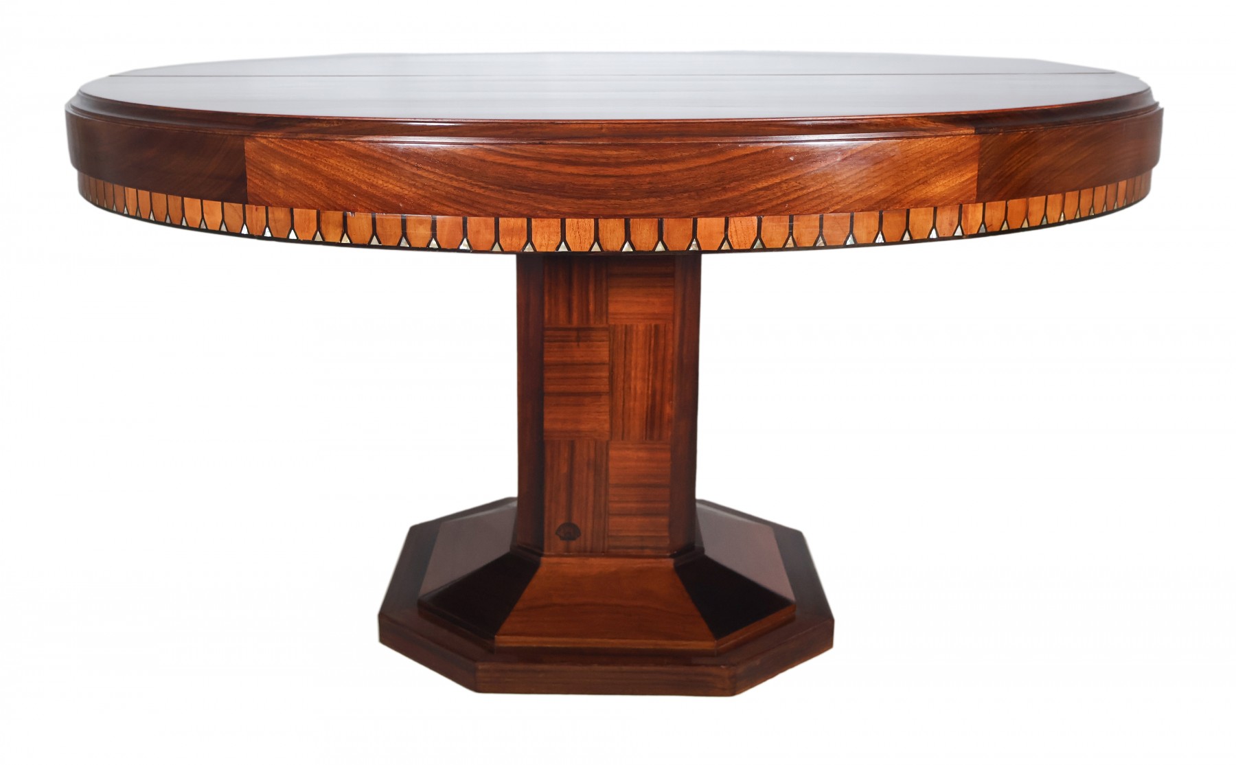 Table ronde à rallonges en acajou et palissandre, époque Art déco.