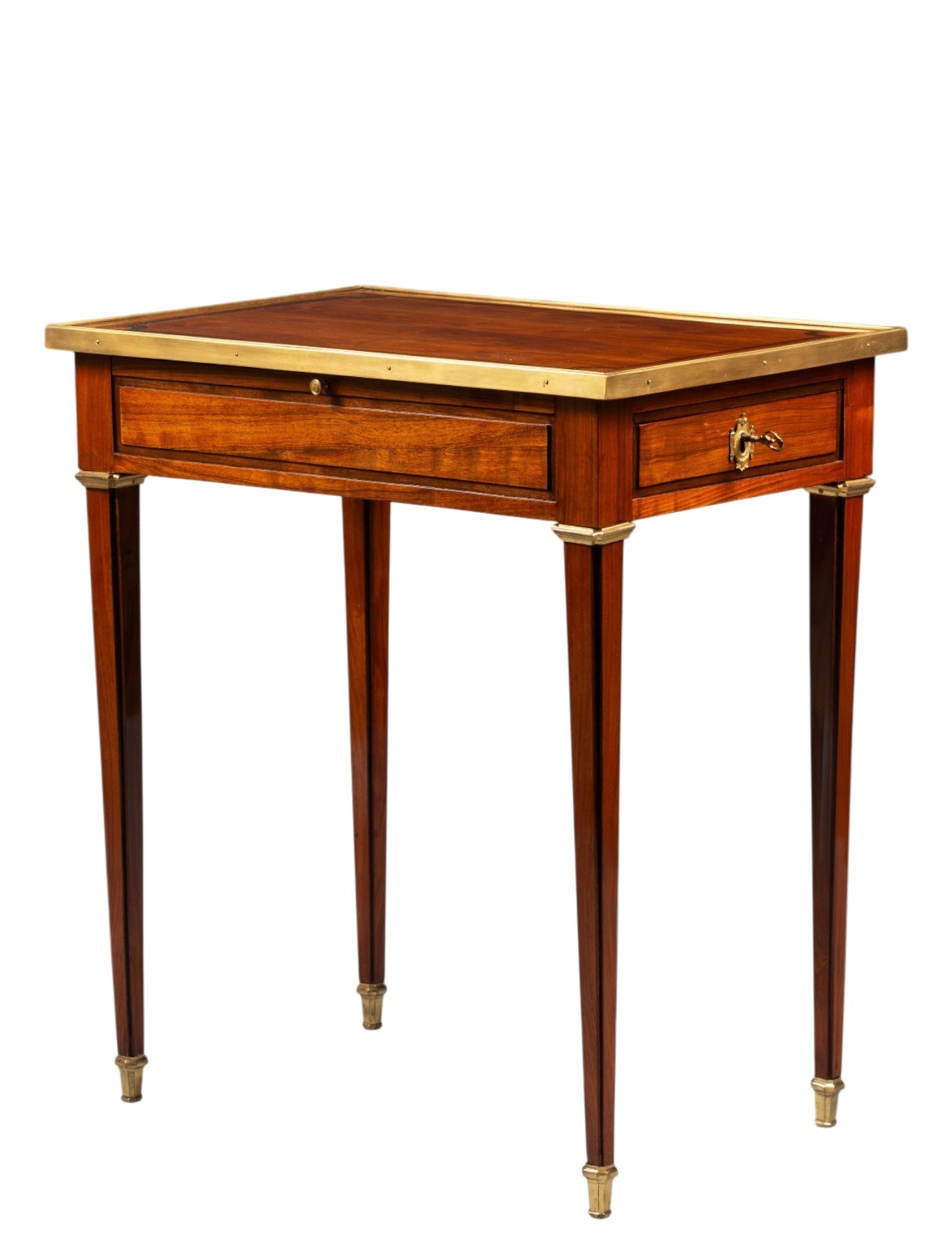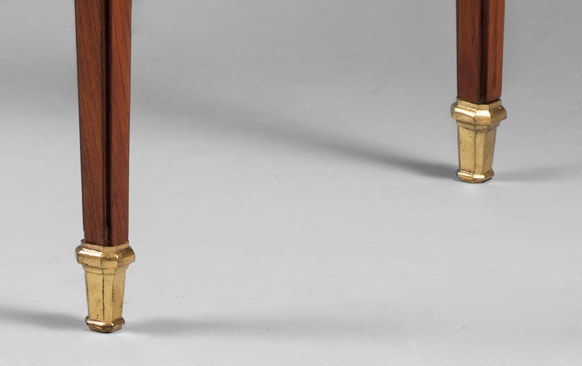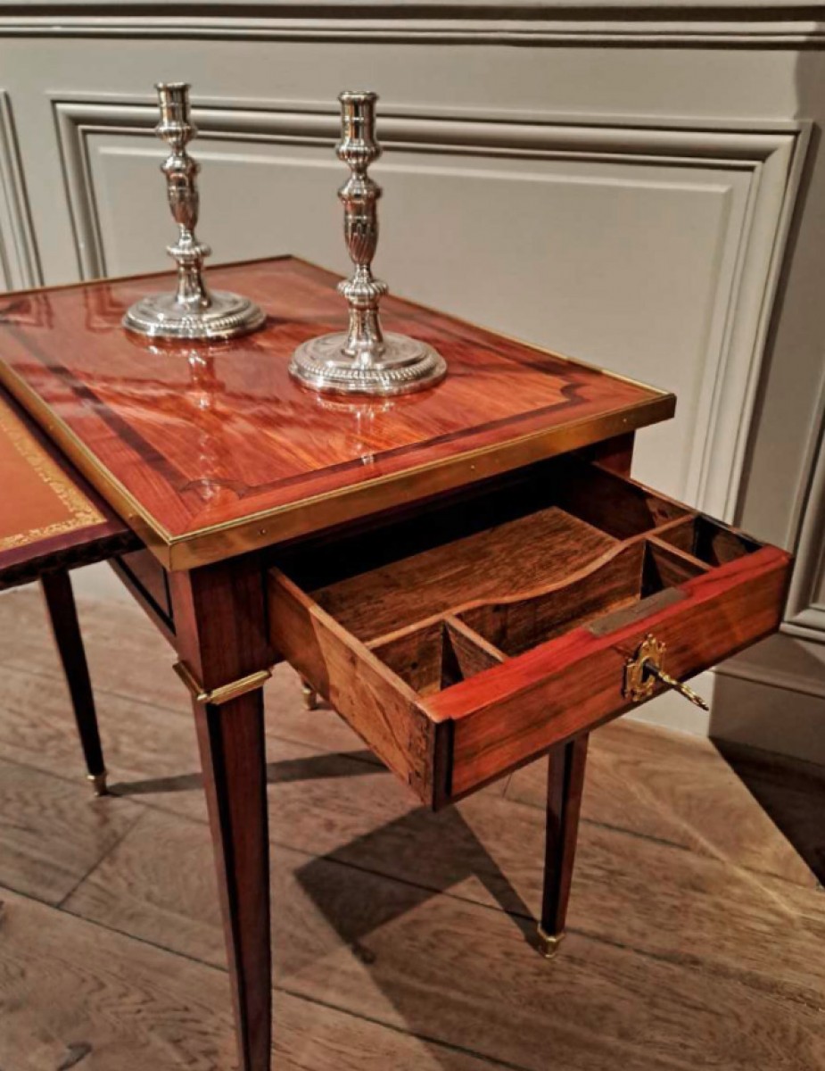 Cette petite table de salon ouvre à un tiroir en longueur, et présente une tirette recouverte de cuir dans le sens de la profondeur. Ses fonctions d’écriture et de rangement étant plutôt anecdotiques, ce type de table était en général destiné à un salon ou un boudoir, pour y poser une source de lumière. De forme rectangulaire, elle repose sur des pieds à section carrée, et fuselés. La sobriété apparente ne masquera pas aux amateurs l’élégance et la précision : Le plateau est finement marqueté en amarante et bois de rose, ceint d’une lingotière épurée, en bronze doré. Travaillés avec les mêmes bois précieux, la ceinture et les pieds sont ornés de tables saillantes, donnant à cette table une ligne très « chic ». Les bronzes, petits et peu nombreux, n’ont à bien y regarder, rien de simple ; les bagues nerveuses, les sabots allongés et structurés à la forme des pieds, et l’entrée de serrure très originale, sont tous parfaitement ciselés et dorés.