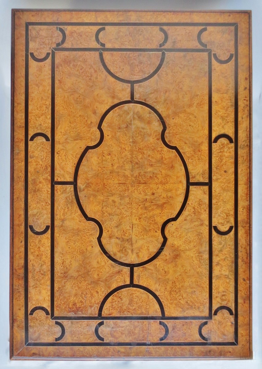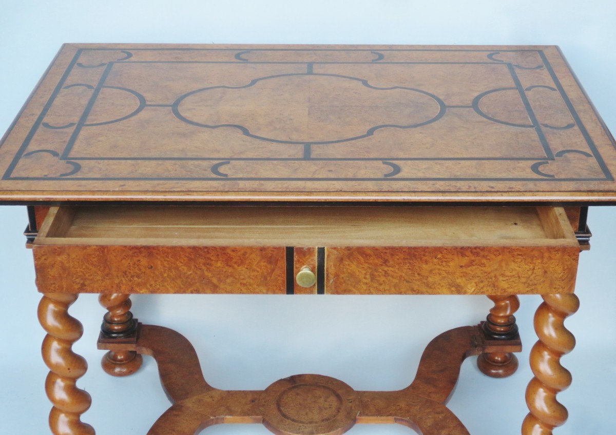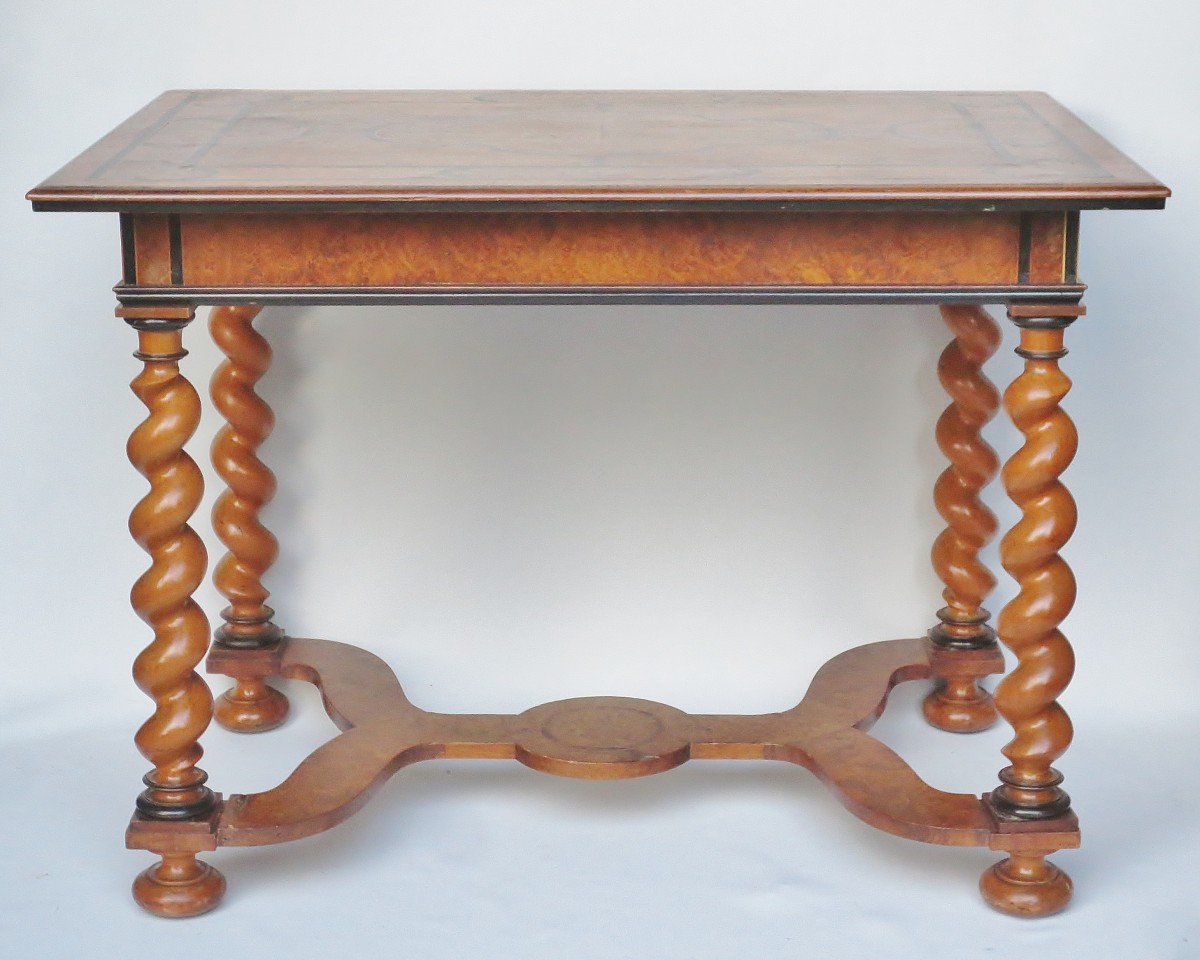 Cette table en bois blond est de style Louis XIII, elle ouvre par un tiroir en ceinture, ses quatre montants en érable sont torsadés et reliés entre eux par une entretoise en X, ils reposent sur des pieds sphériques et aplatis qui sont eux aussi en érable, le plateau et la ceinture sont en loupe d' érable rehaussé de filets d' ébène, le travail de marqueterie géométrique rappelle ce que réalisait la dynastie des Haches à Grenoble.