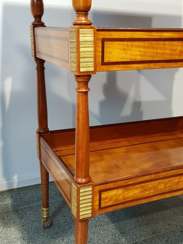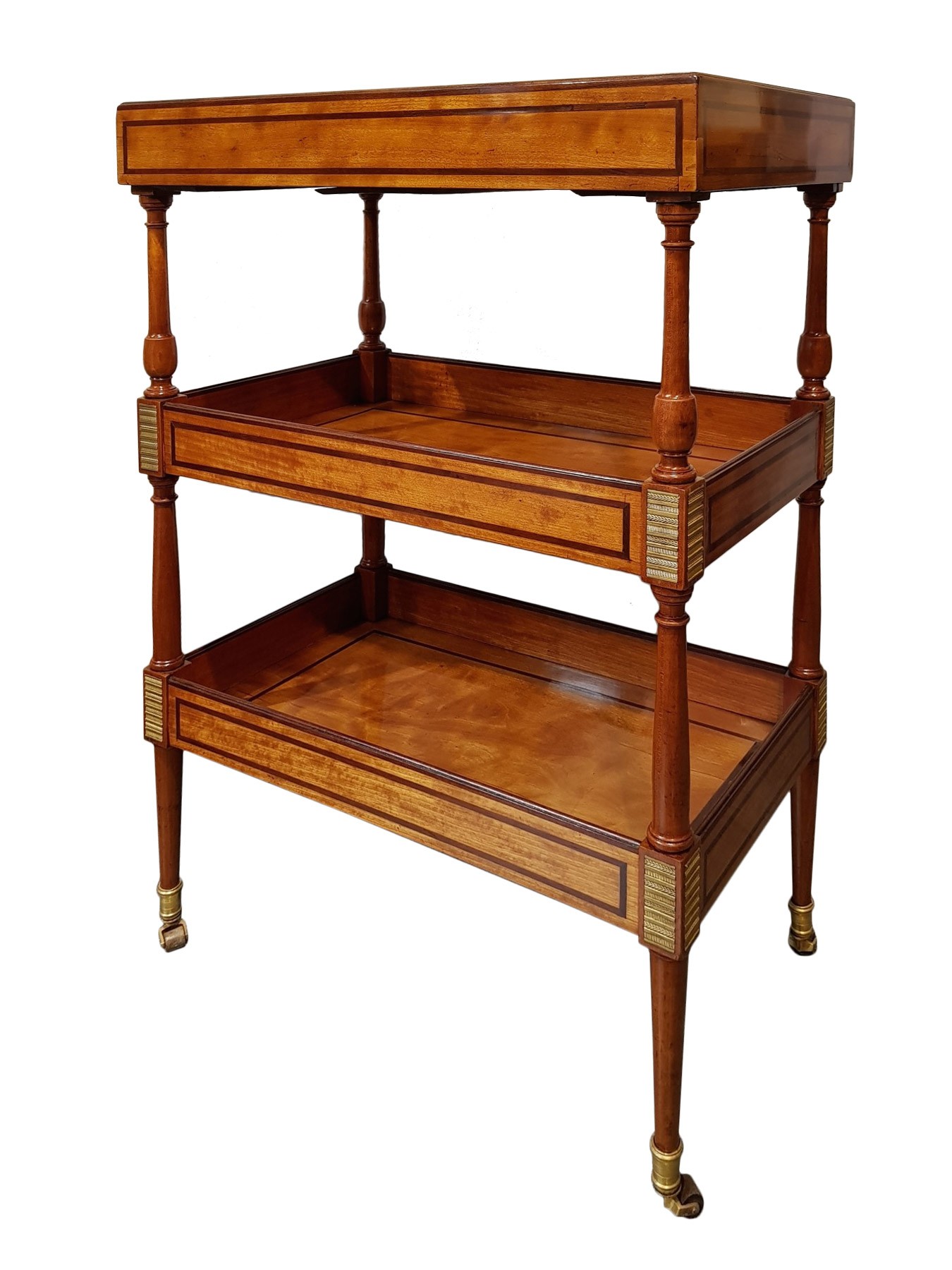 Petite table vide-poches, à 3 plateaux, en citronnier de Ceylan, amarante et bronze doré, les sabots d'origine en gaiac.