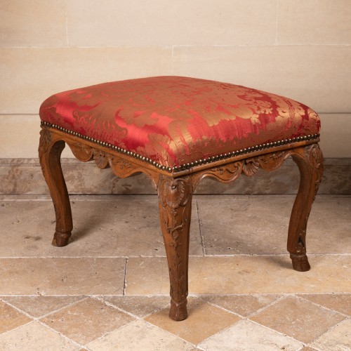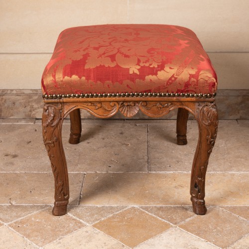 Tabouret de forme rectangulaire en orme mouluré et sculpté , ceintures à décor de coquilles centrées autour de feuillages , les pieds cambrés ornés d'une coquille suivie de lambrequins , se terminant par des sabots de bouc .