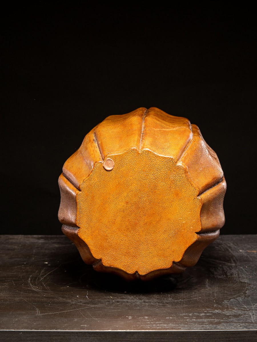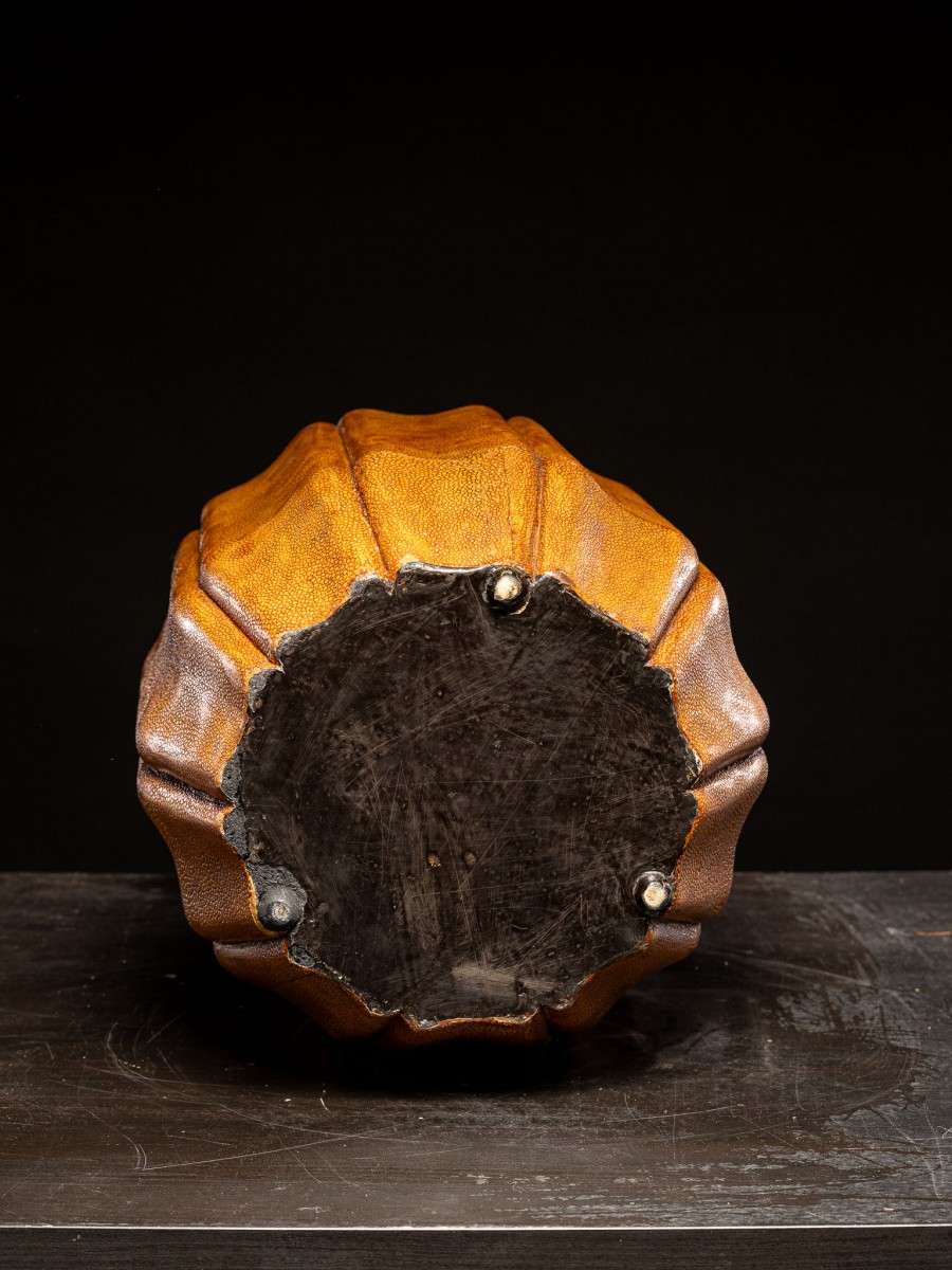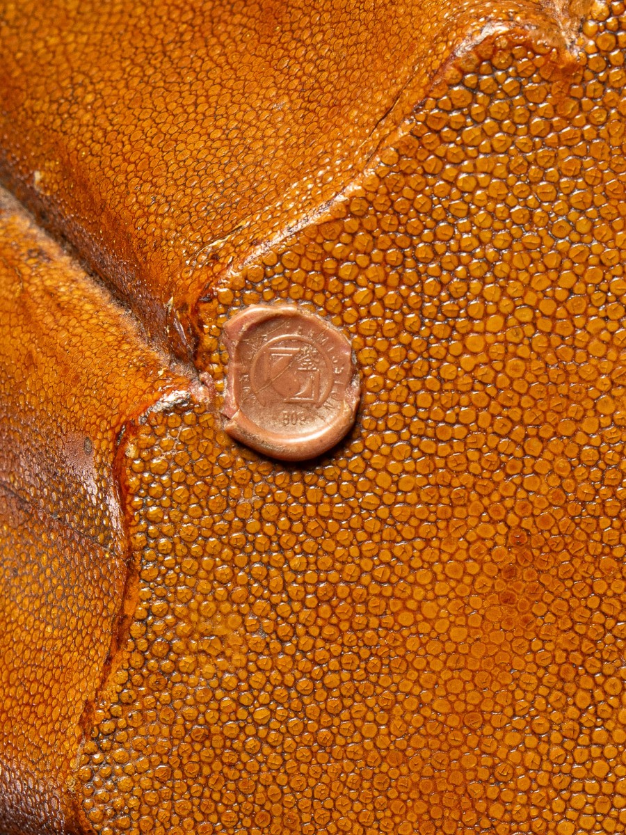 Le tabouret est fabriqué à la main en bois et présente des traces d’un sceau de cire.