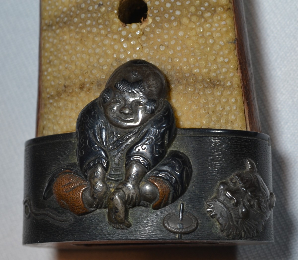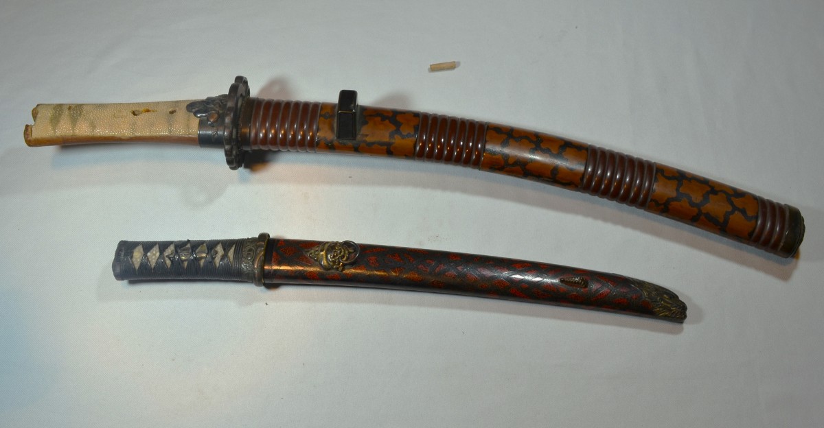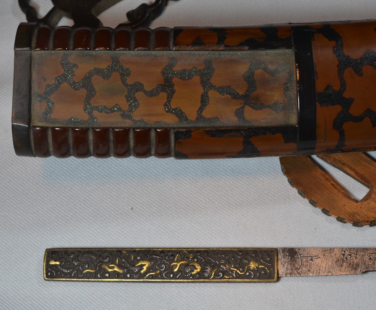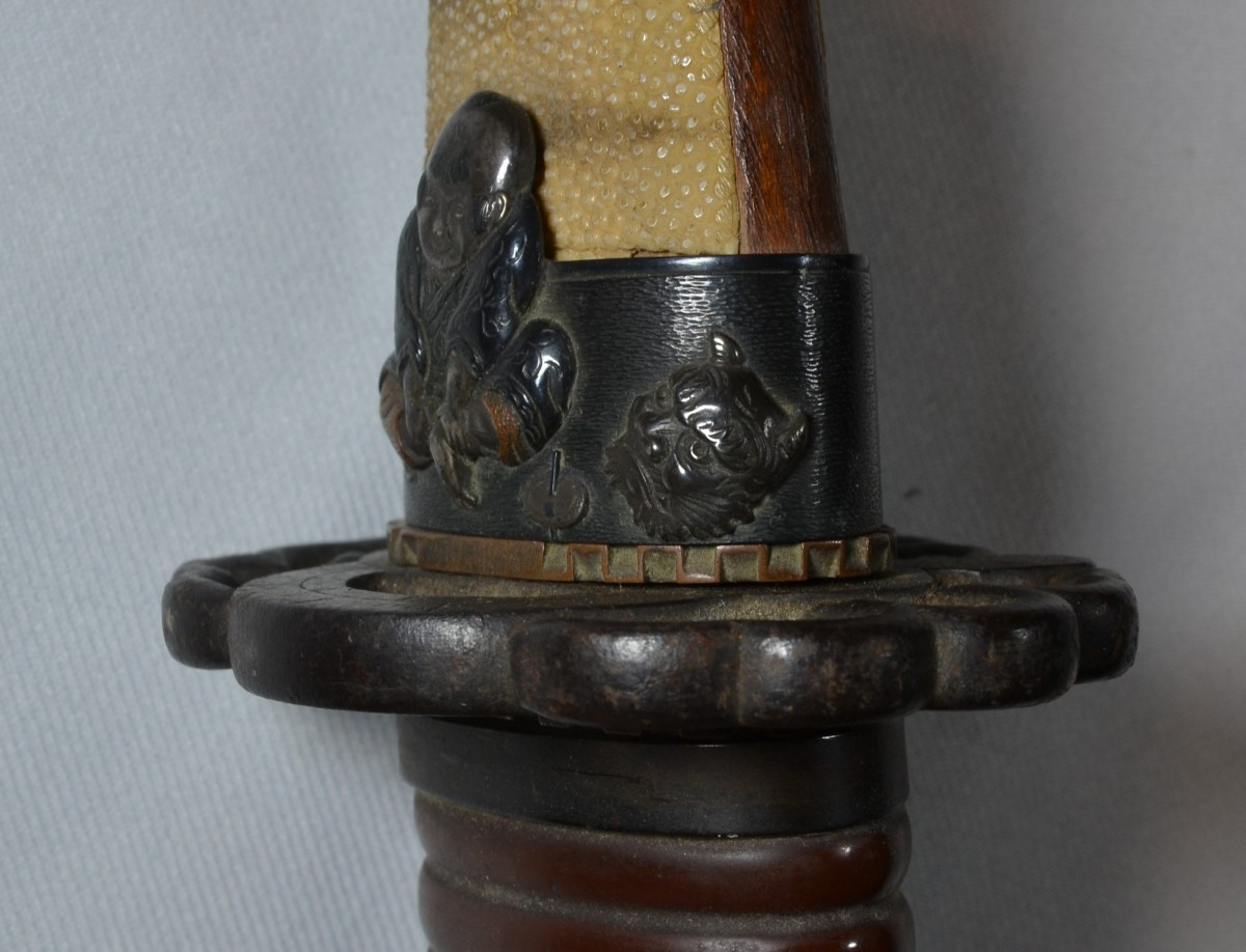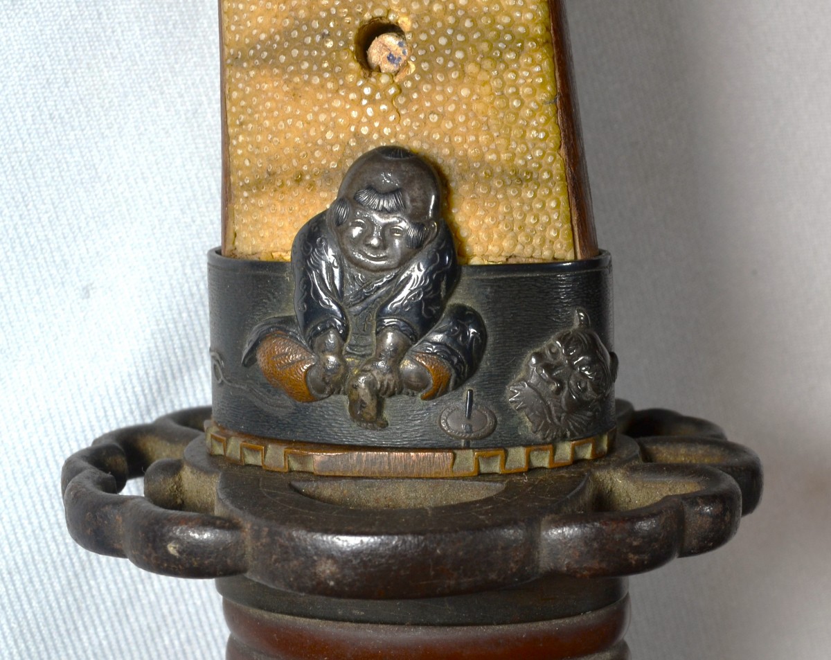 Cette arme japonaise a des dimensions inhabituelles, ses proportions sont celles d'un tanto plutôt que celles d'un wakizashi. Sur une des photos elle est présentée avec un tanto de taille normale ce qui permet d'apprécier la différence de taille. La lame porte plusieurs caractères qui sont bien lisibles, ce qui permettra d'identifier le forgeron, elle a été frottée ,la trempe est effacée, la poignée est percée de 3 trous ce qui indique de nombreux remontage. Les montures sont d'excellente qualité décorées d'enfants et de jouets en shakudo incrusté de sentoku et de shibuichi, elles ne sont pas signées. Le fourreau est en bois recouvert de laque dans des tons de brun orangé pailletée d'un nashiji de nacre. L'espace prévu pour le kozuka est large de 30mm or il n'existe pas de Kozuka dont la largeur excèderait 15mm, voire 16mm. Dans quel but cette arme surdimensionnée fût elle créée? C'est une énigme. Malgré les manques, cette arme est, de par ses dimensions, un ...