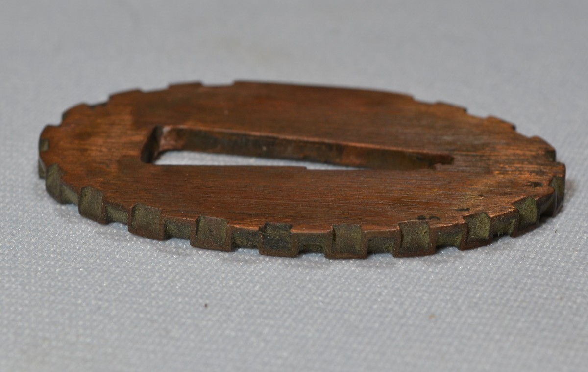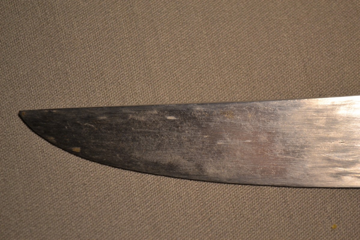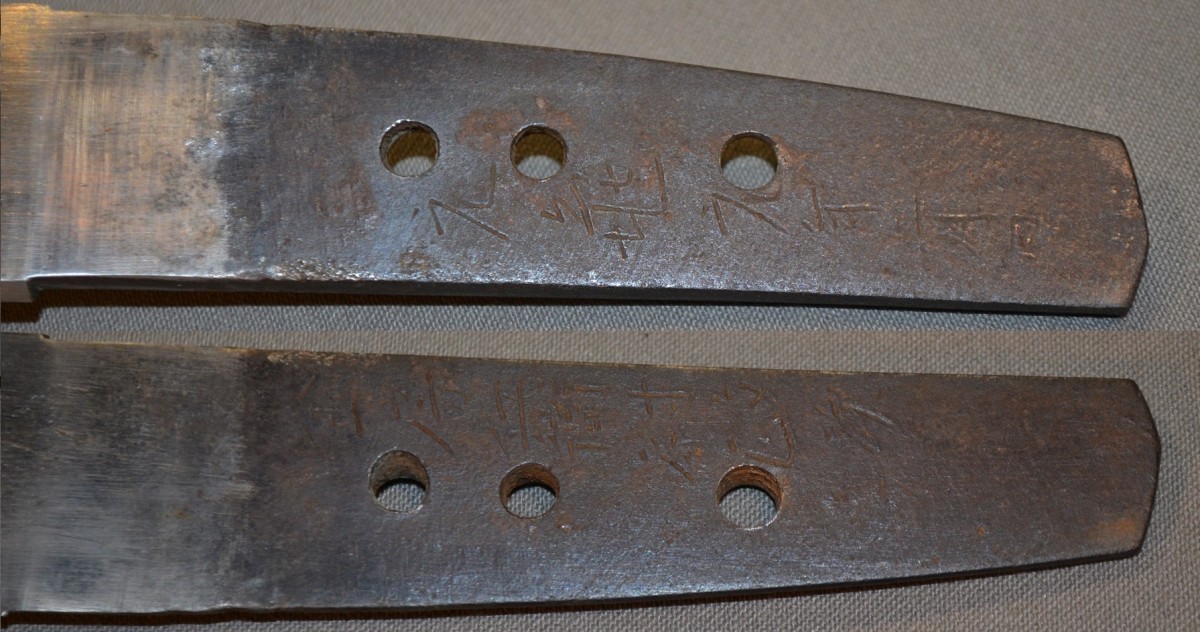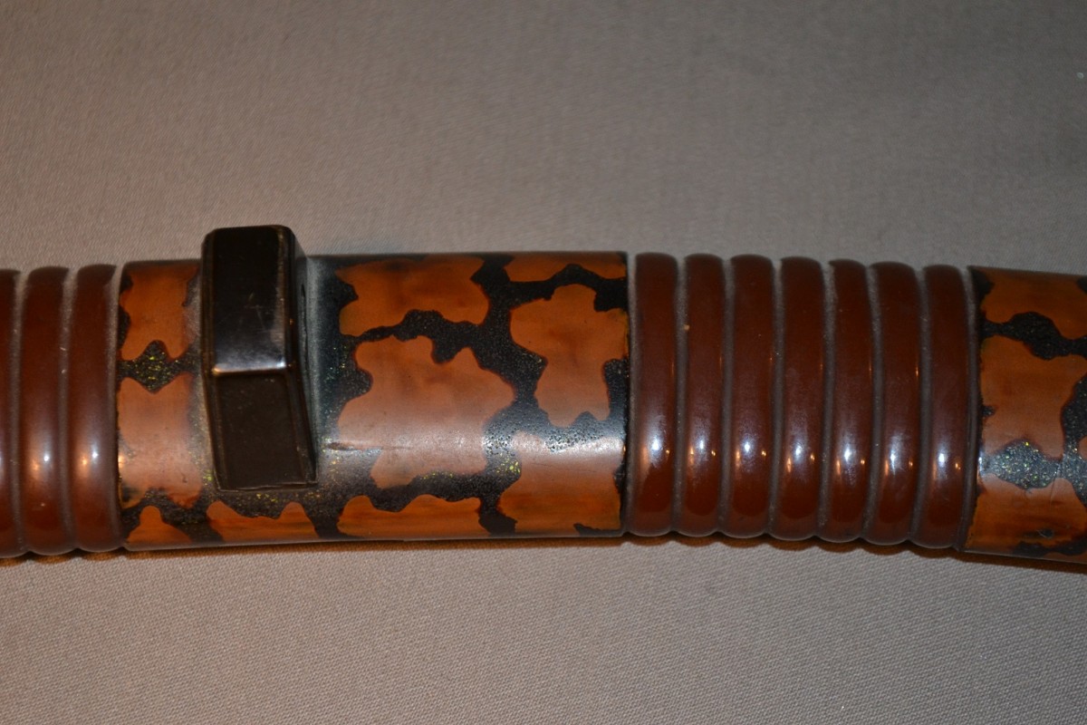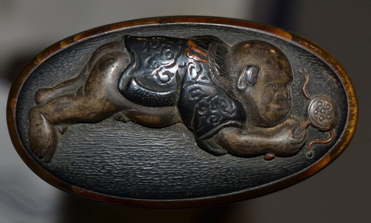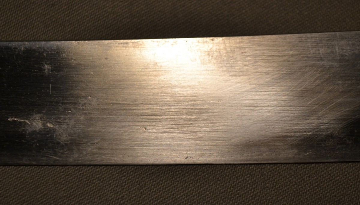 Cette arme japonaise a des dimensions inhabituelles, ses proportions sont celles d'un tanto plutôt que celles d'un wakizashi. Sur une des photos elle est présentée avec un tanto de taille normale ce qui permet d'apprécier la différence de taille. La lame porte plusieurs caractères qui sont bien lisibles, ce qui permettra d'identifier le forgeron, elle a été frottée ,la trempe est effacée, la poignée est percée de 3 trous ce qui indique de nombreux remontage. Les montures sont d'excellente qualité décorées d'enfants et de jouets en shakudo incrusté de sentoku et de shibuichi, elles ne sont pas signées. Le fourreau est en bois recouvert de laque dans des tons de brun orangé pailletée d'un nashiji de nacre. L'espace prévu pour le kozuka est large de 30mm or il n'existe pas de Kozuka dont la largeur excèderait 15mm, voire 16mm. Dans quel but cette arme surdimensionnée fût elle créée? C'est une énigme. Malgré les manques, cette arme est, de par ses dimensions, un ...