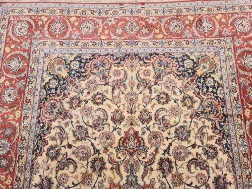 Tapis Ispahan datant d'environ 1975, provenant d'Iran et signé "Iran Serafian". Le velours de ce tapis est fait de laine d'agneau de grande qualité, connue sous le nom de laine kork. On peut trouver quelques touches de soie entourant les fleurs, tandis que les fondations, les chaînes, les trames et les franges sont en soie. Le tapis est en bon état général et présente une densité d'environ 10 000 nœuds par décimètre carré.