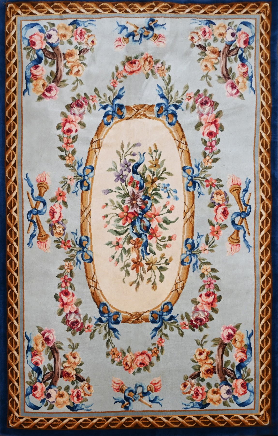 Ce tapis se distingue par sa composition harmonieuse et sa palette de couleurs douces. Sur un fond bleu ciel lumineux, un médaillon central ovale de couleur crème accueille un bouquet foisonnant aux teintes pastels (rose poudré, ocre, mauve).
