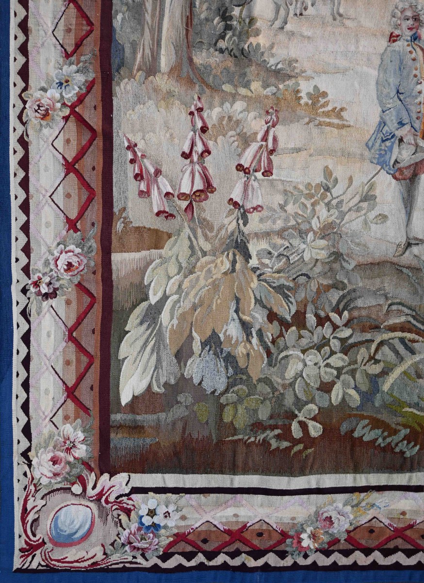 Cette œuvre magistrale, tissée par la Manufacture d'Aubusson au XIXe siècle, revisite avec brio les scènes galantes du siècle précédent. Elle témoigne de l'excellence technique de cette époque, capable de recréer l'élégance de la vie de cour avec une clarté et une fraîcheur de coloris remarquables.