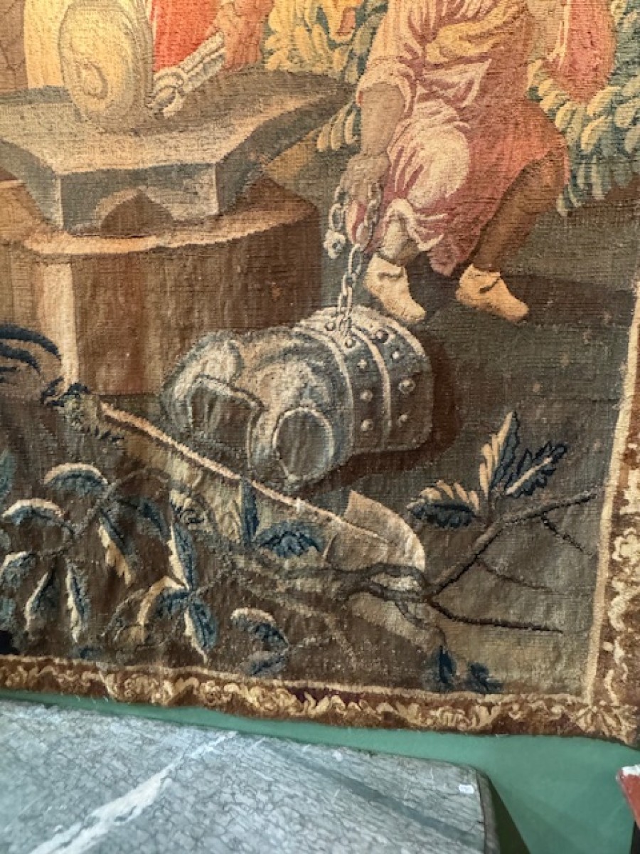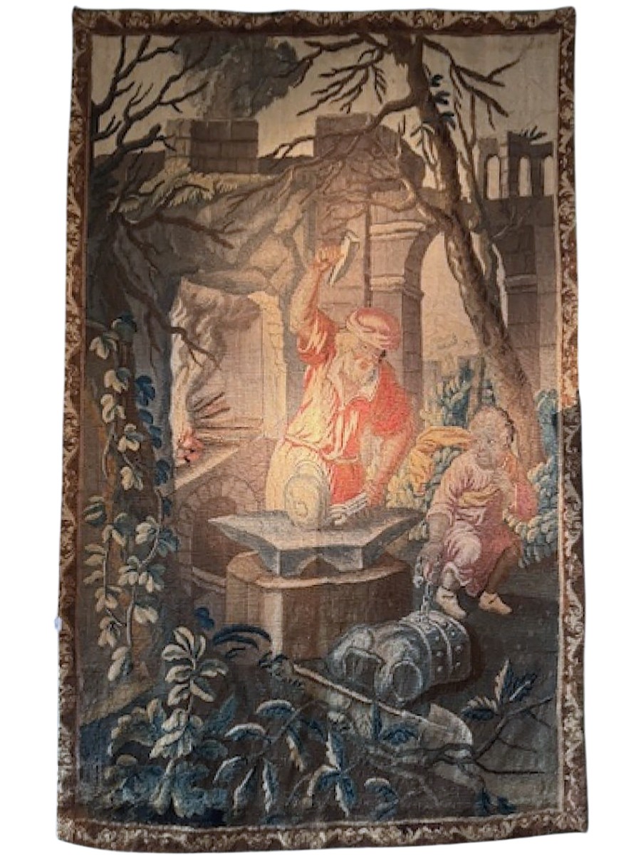 Tapisserie d'Aubusson en laine et soie d'époque 18ème représentant Vulcain fabricant l'armure d'Achille . Restauration d'entretien et doublure refaite .