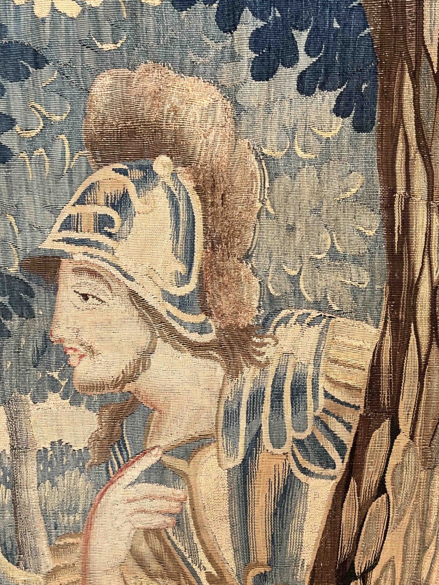 Cette œuvre magistrale met en scène un retour triomphal dans un paysage idéalisé : personnages drapés à l’antique, guerrier casqué accueilli sous les frondaisons, figures allégoriques et architecture en arrière-plan composent une narration vivante et solennelle. La richesse des détails – expressions délicates, gestuelle théâtrale, profondeur du paysage, finesse du traitement des drapés – témoigne du savoir-faire incomparable des ateliers flamands de l’âge d’or.