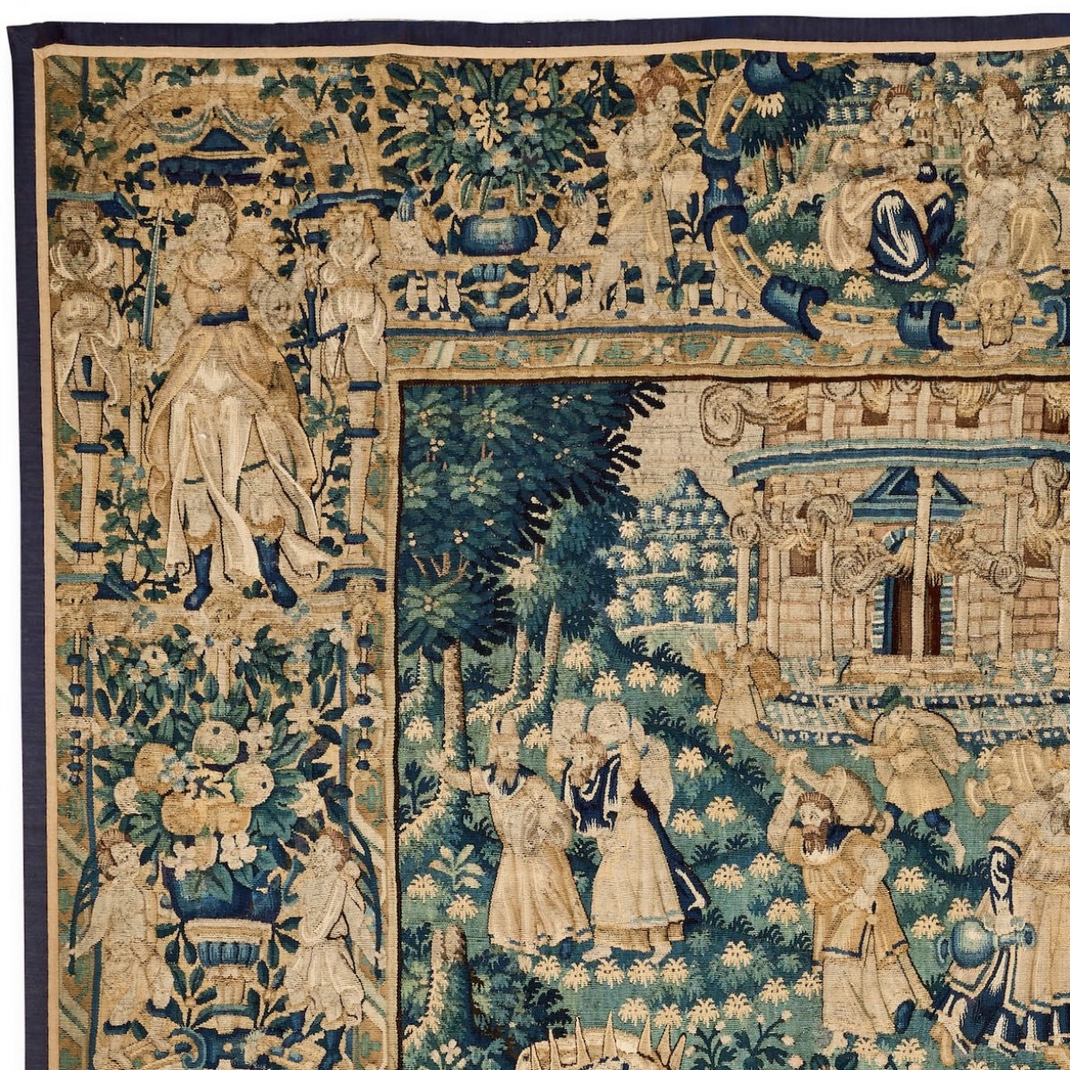 Une tapisserie finement tissée représentant le Temple de Babylone en flammes, avec les habitants de Babylone courant avec leur butin de la tour, pour revenir plus tard chercher ses briques également. Dans le coin inférieur gauche, une reine est assise dans une robe élaborée, sur ses genoux elle est accompagnée de son dragon de compagnie, en bas à droite sont assis un noble et sa femme, leur enfant sur ses genoux, le père offre une pomme à l'enfant, une référence au péché originel, la scène se joue dans un paysage verdoyant. La tapisserie est entourée d'une bordure ornée de figures allégoriques, de couples nobles dans des paysages pastoraux, de putti, de bouquets de fleurs et de fruits, de balustrades, de cariatides et de faunes jouant de la flûte. Des bordures brunes ultérieures encadrent la composition, soutenue et ...